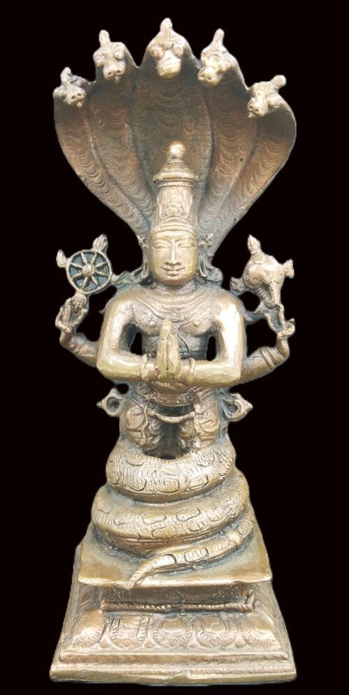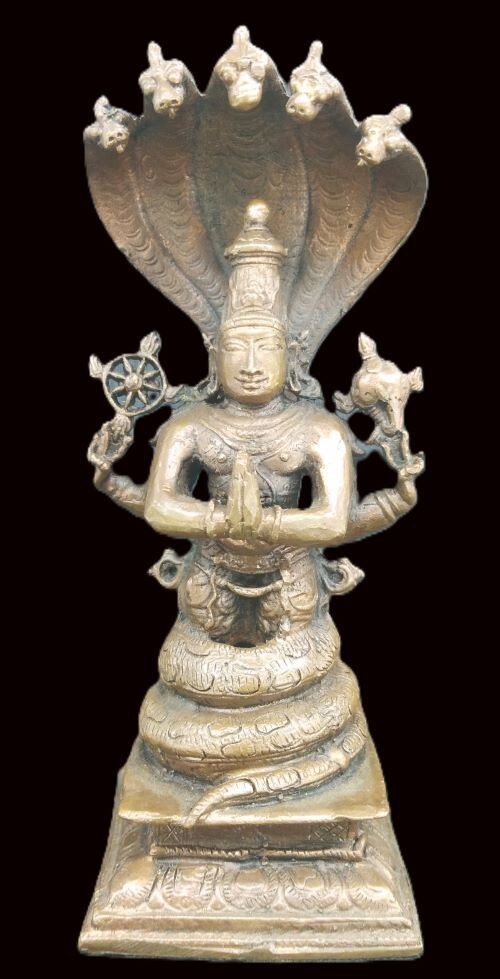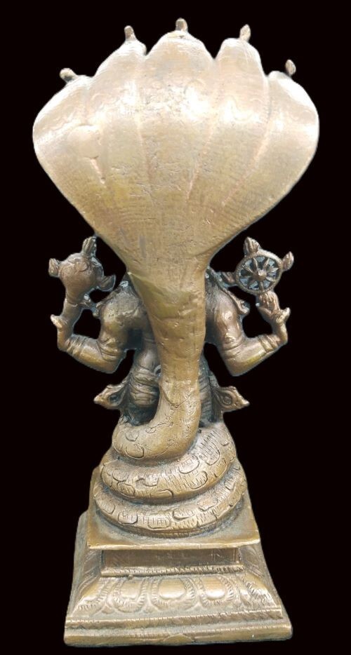 Beautiful Patanjali Murti seated on big size five headed snake In Pure Solid Copper artistically crafted in solid copper by skilled artisans of South India having four hands , two upper hands holding shankha and chakra .