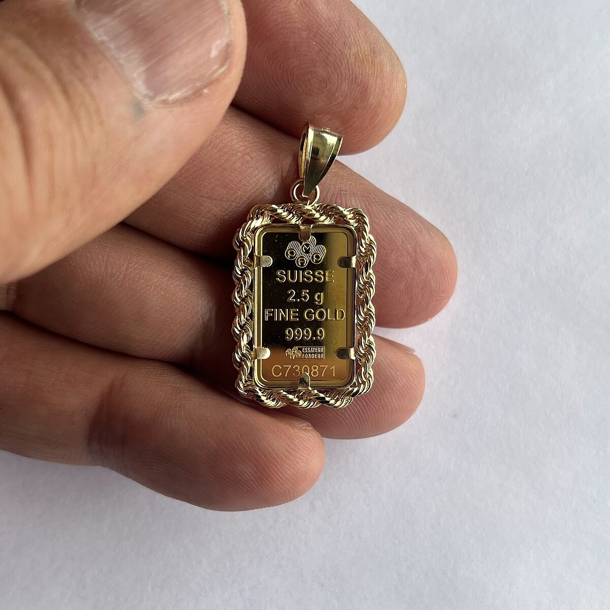 The 2.5 Gram Lady Fortuna pendant features a rectangular Suisse gold bar suspended on a 14K yellow gold rope chain frame. This elegant piece of fine jewelry is perfect for special occasions like anniversaries or birthdays.