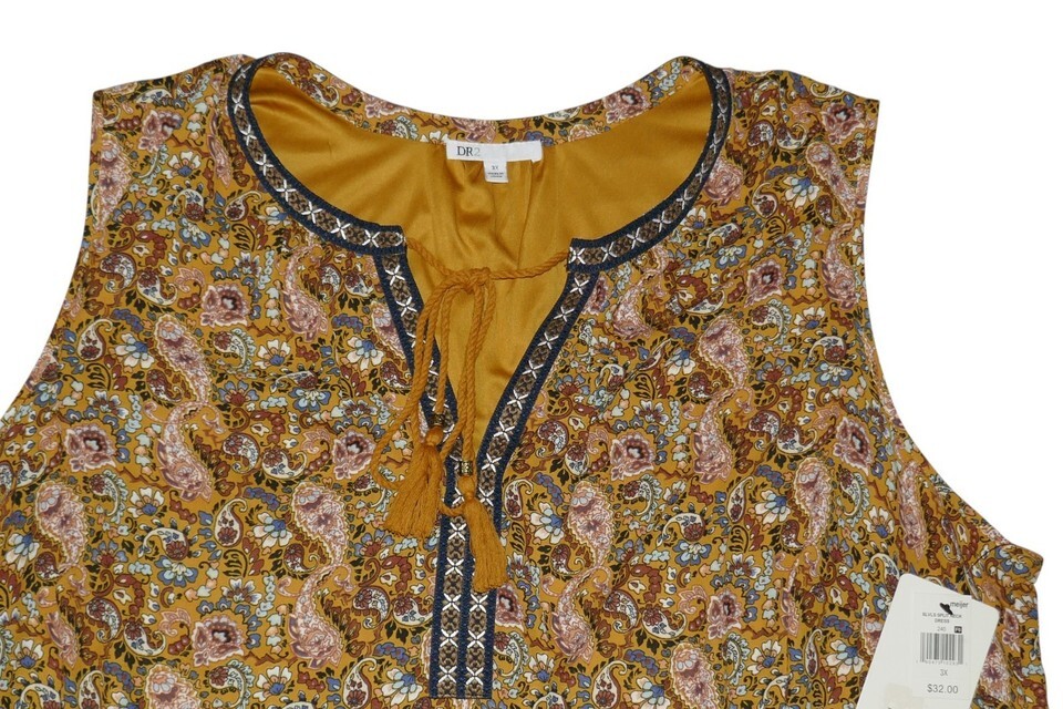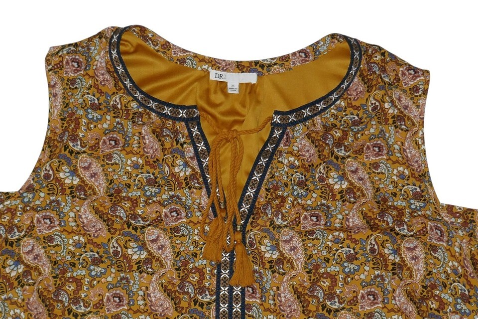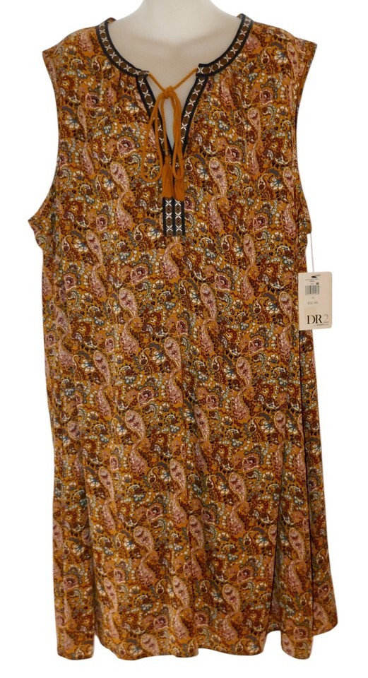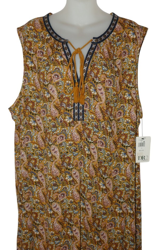 This DR2 by Daniel Rainn Mustard Paisley Print Sleeveless Boho Dress in size 3X is a stylish and comfortable option for casual occasions during the summer and spring seasons. Measures approx. 28" from pit to pit and 40" from shoulder to bottom hem. The dress features a V-neckline, pullover closure, and tasseled accents, with a knee-length design and a trapeze swing style. Perfect for women looking for a trendy and relaxed fit in a bohemian theme.