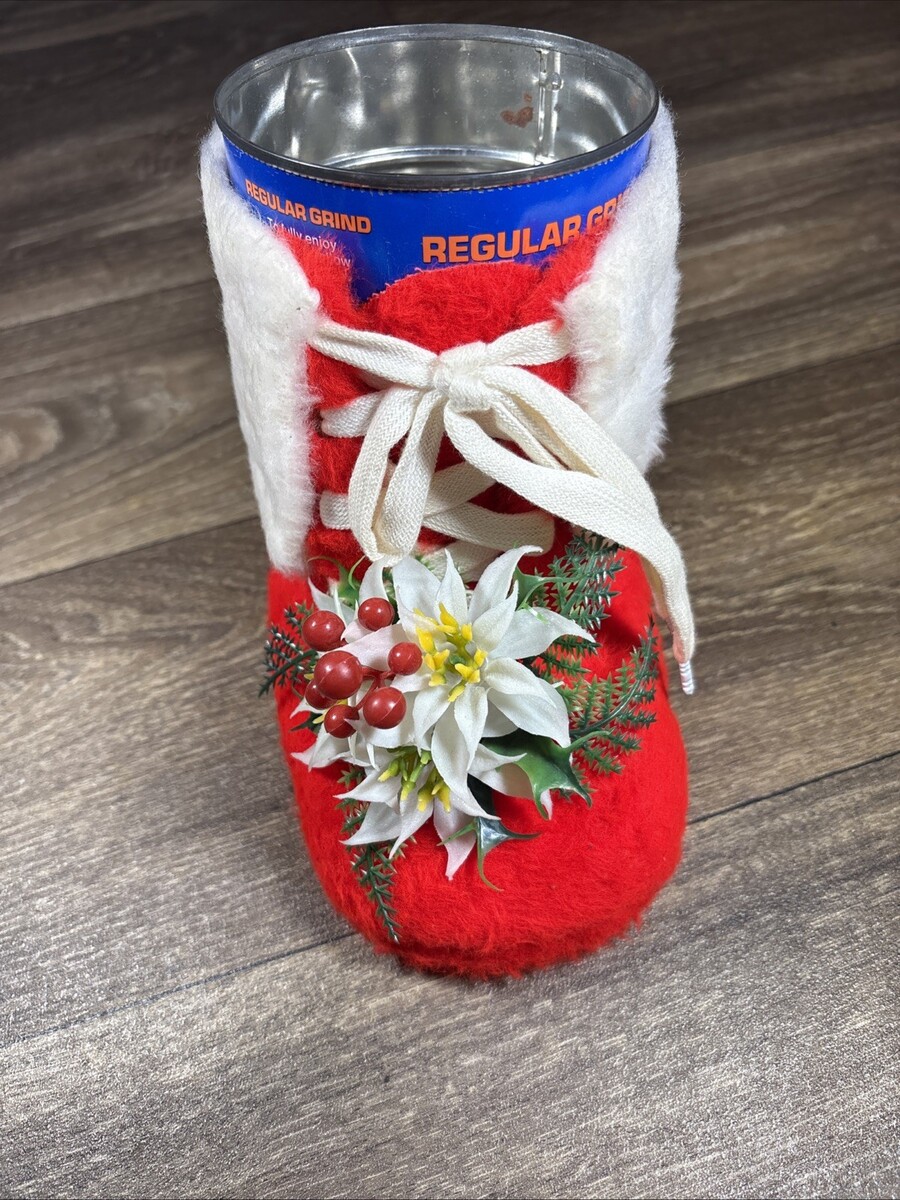This vintage Christmas holiday stocking boot coffee can is a festive addition to your holiday decor collection. The plush red material and classic design make it a perfect ornament for adding a touch of nostalgia to your home during the festive season. Perfect for displaying in your holiday display or as a unique gift for a collector of holiday memorabilia.