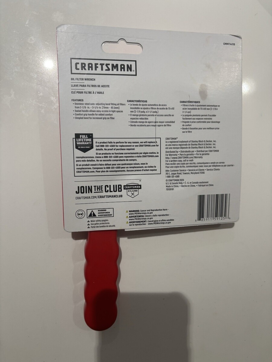 The CMMT14119 Craftsman Oil Filter Wrench with a Swivel Handle is a versatile tool designed for removing and installing oil filters. With a size range of 2-7/8'' to 3-1/4'', this wrench is suitable for various filter sizes. The swivel handle feature allows for easy maneuverability, making it a convenient addition to any automotive tool collection. Made by the trusted brand Craftsman, this oil filter wrench ensures quality and durability for all your maintenance needs.