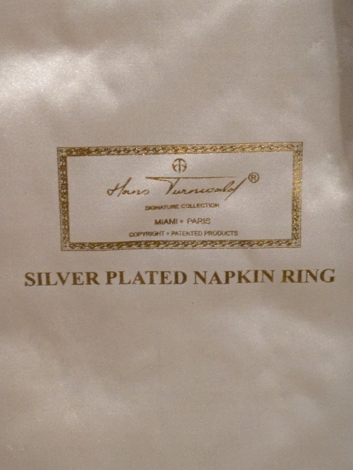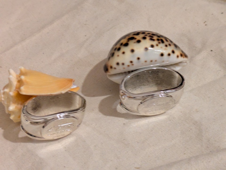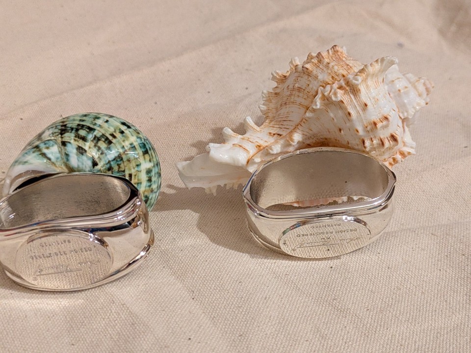 Set of 4 Hans Turnwald Seashell Silver Plated Napkin Rings in a red box. The napkin rings feature a shells pattern and are made of sea shell material. They are part of a collection of 4 items, adding a beach decor touch to your dining table. The design is original and colorful, making them a charming addition to your kitchen linens and textiles.