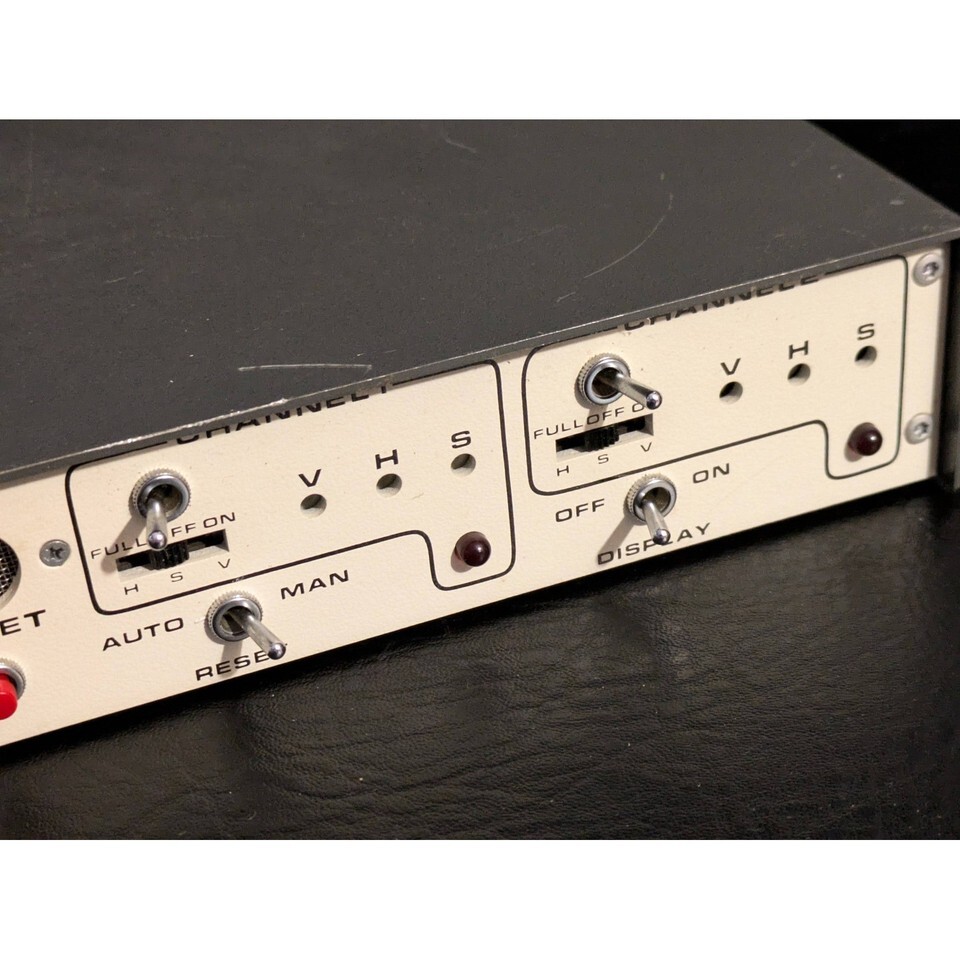 Unleash seamless video control with this vintage RCA 1460VC Video Switcher, serial number 5705. Imagine effortlessly directing your visual narratives, transitioning between camera feeds with intuitive toggle switches for 'Full On' or 'Full Off' functionality, and utilizing the 'Auto' and 'Manual' modes to perfectly time your shots. The 'Reset' buttons offer instant control, while the 'On Power' indicator light assures you of its ready status. This robust unit, with its distinct 'V', 'H', and 'S' settings on its dual channel inputs, promises reliable performance for any video production setup.
