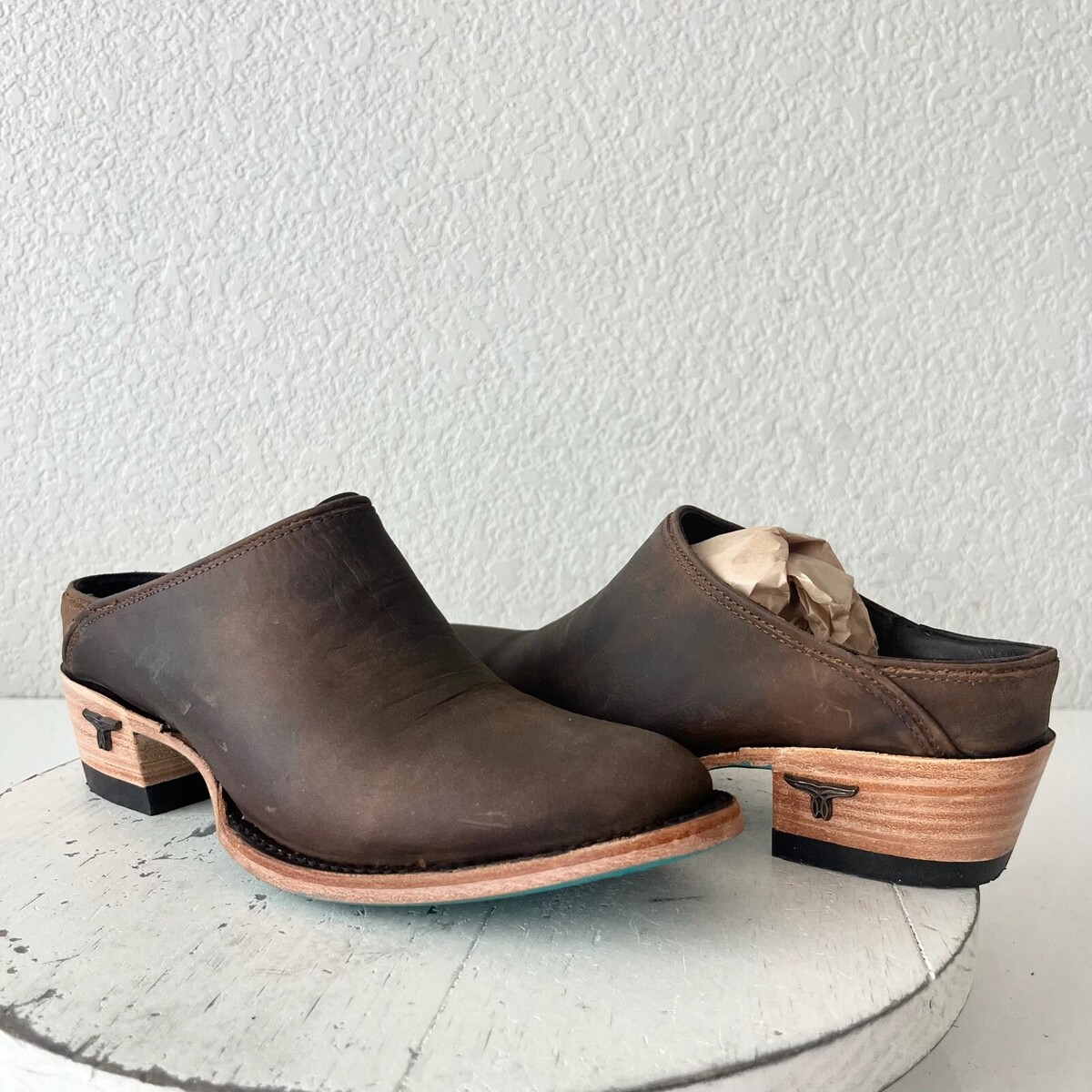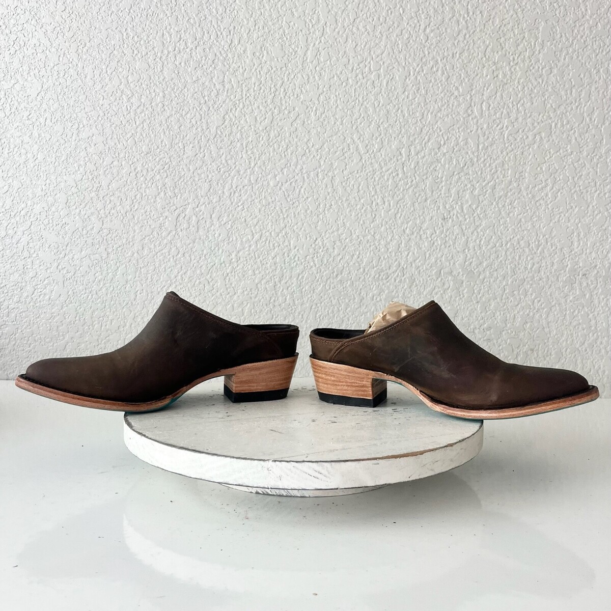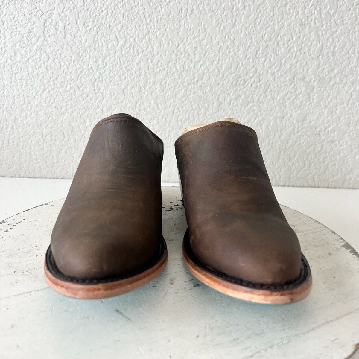 Condition: These are new shoes. The leather is distressed by design. There is a dark spot on the inside left mule. They fit true to size and will come with a Boot box.