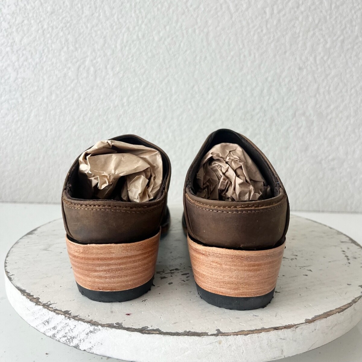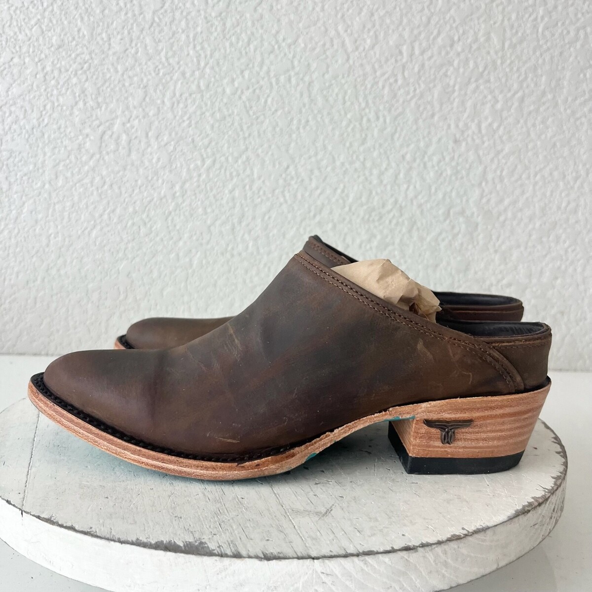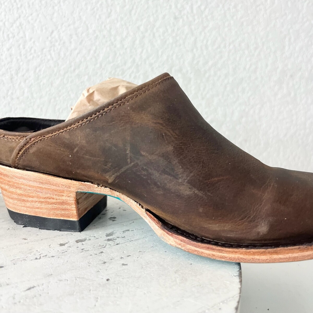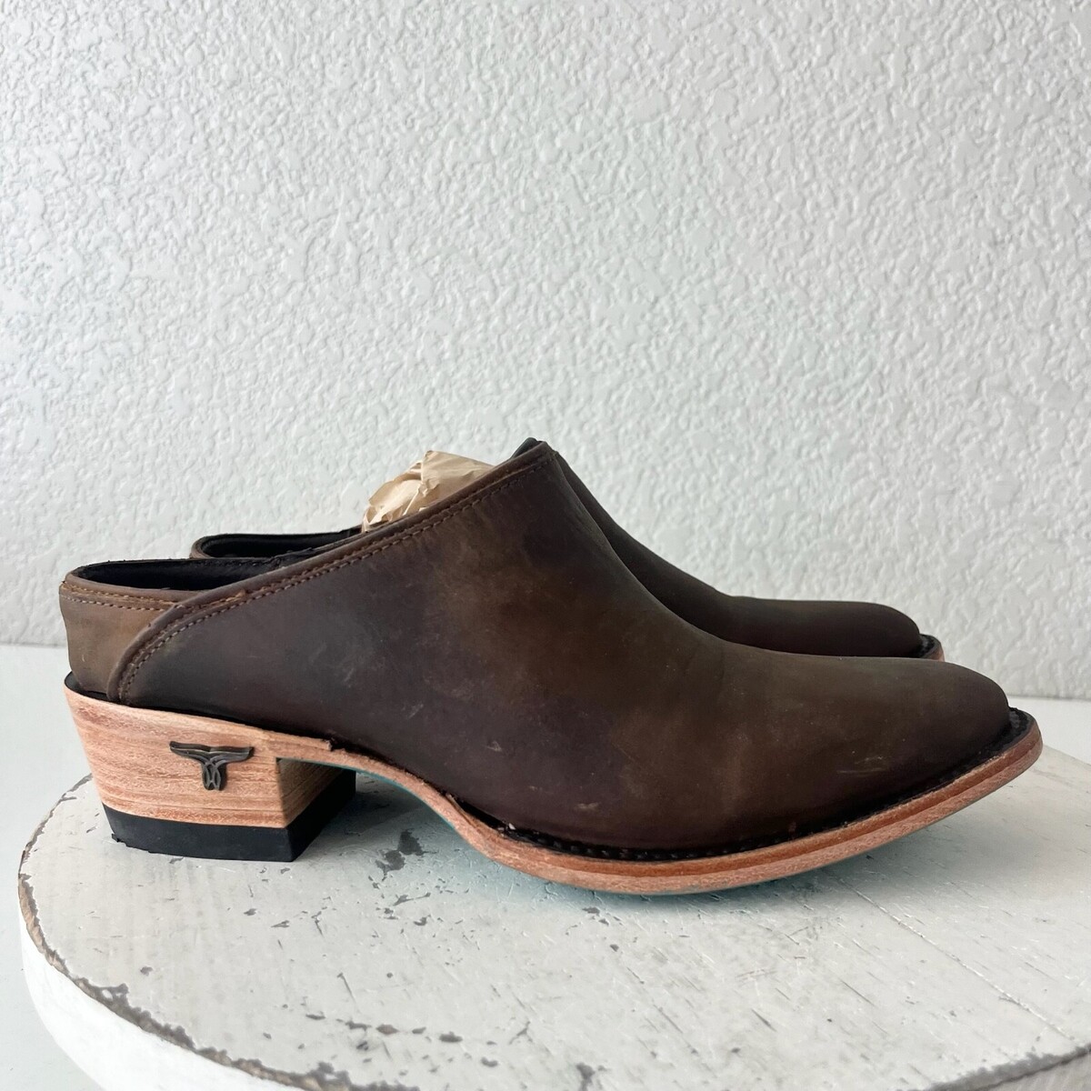 Condition: These are new shoes. The leather is distressed by design. There is a dark spot on the inside left mule. They fit true to size and will come with a Boot box.