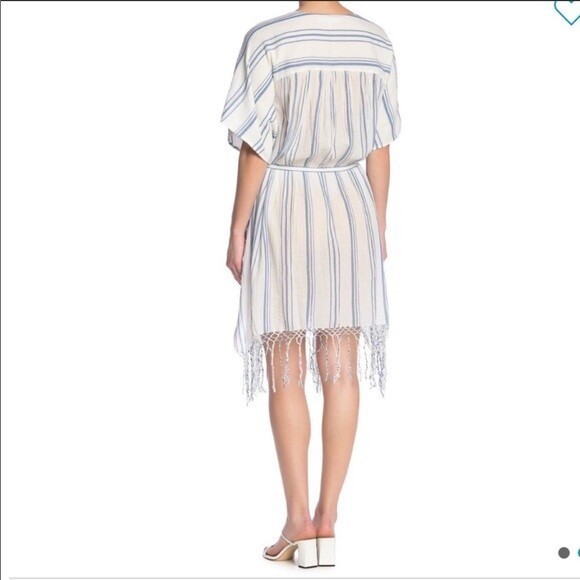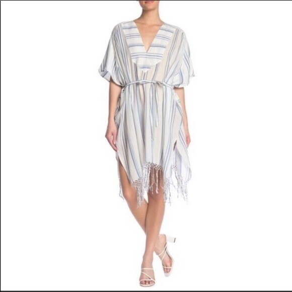 - V-neck - Short dolman sleeves - Slips on over head - Waist tie - Allover striped pattern - Fringe hem - Approx. 36" length - Imported