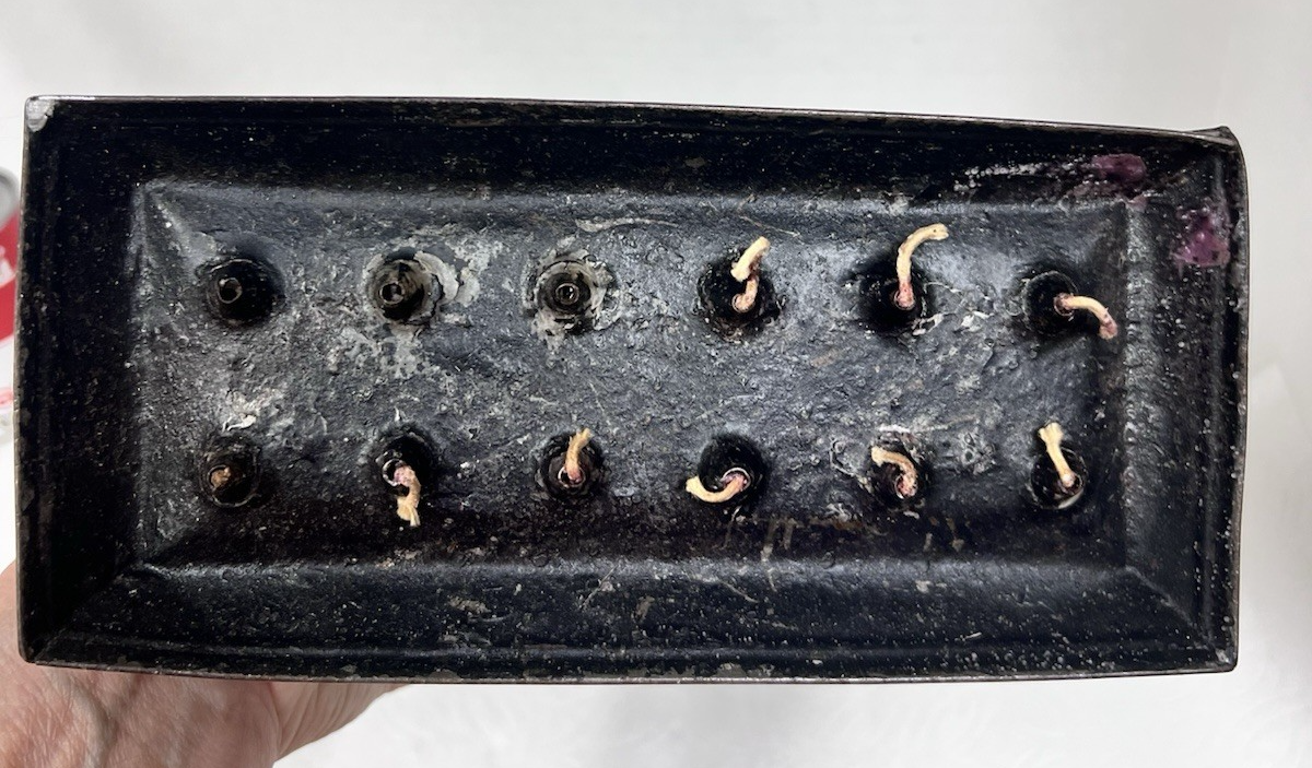 Antique Primitive Metal Candle 12 Hole Mold 11 Inch Tall w Handle The paint has wear; the rim is crooked, and it has wax inside of it. The base measures 8 x 3 7/8 inches it will make candles that are 10 inches long they don't look super tapered more straight
