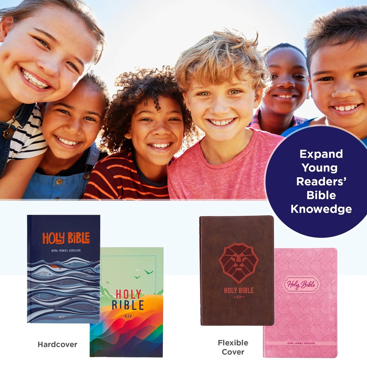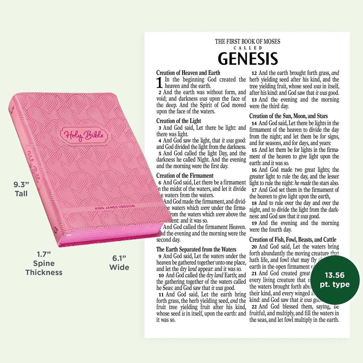 Celebrate your daughterโs birthday with this Blossom Pink Heart Faux Leather KIDโS KING JAMES VERSION BIBLE, a gift that will nurture independent Bible study and deepen her connection with Godโs Word. This enchanting Bible will capture a girlโs imagination with its vibrant feature pages bursting with a kaleidoscope of colors. As she delves into its content, she will find interesting facts and explanations that bring the text to life. An enchanting pink-foiled heart design embellishes the covers of this blossom pink faux leather Bible, adding a delightful touch of charm. The title, which is foiled in dazzling pink, adorns a luxurious blossom pink faux leather patch that is appliquรฉd to the front cover with pink topstitching. The version reference appears in pink foil at the bottom of the cover. This KJV KIDS BIBLE KING JAMES VERSION for Girls showcases luxurious features that exude elegance and style.