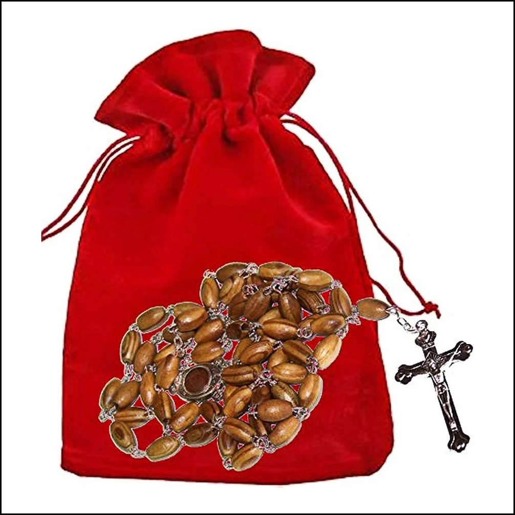 OLIVEWOOD ROSARY WITH SOIL FROM BETHLEHEM by HOLY LAND MARKET, 10mm x 6mm OLIVEWOOD BEADS, with VELVET BAG, AUTHENTICITY CARD, and NATIVITY STORY BOOKLET.