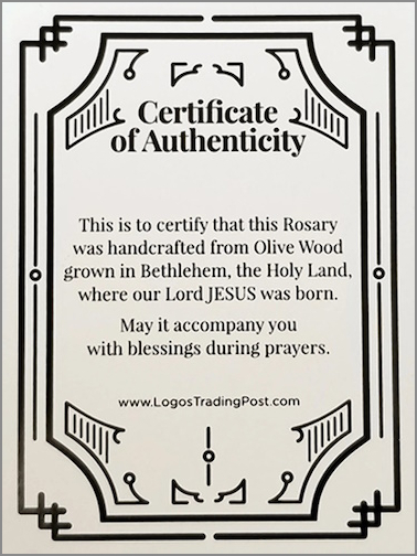 - Items included: Olive Wood Rosary, Velvet Bag, Certificate of Authenticity, Nativity Story Booklet