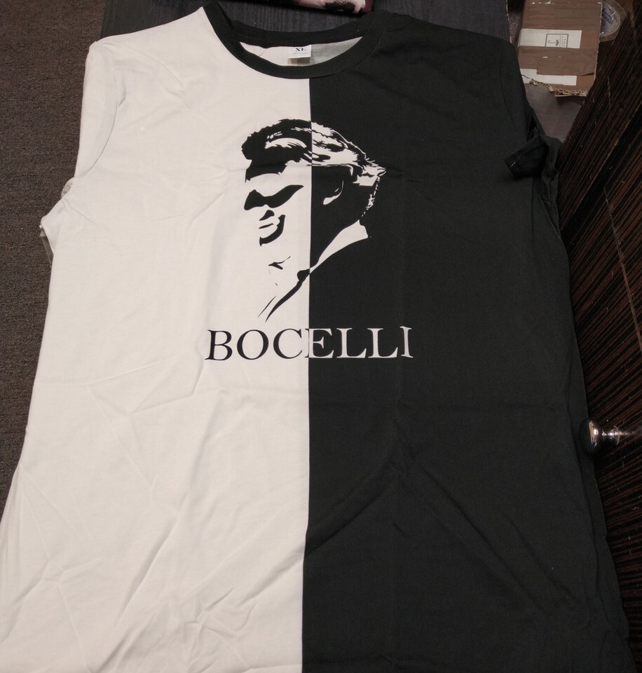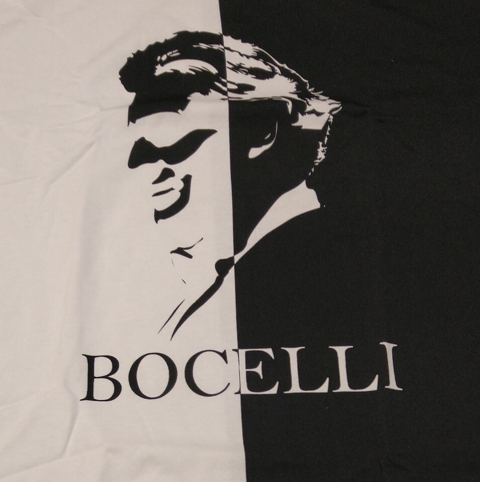 Featuring an image of the famous tenor Andrea Bocelli in Silhouette with "Bocelli" written underneath. The shirt is half black and half white contrasting with the Silhouette.
