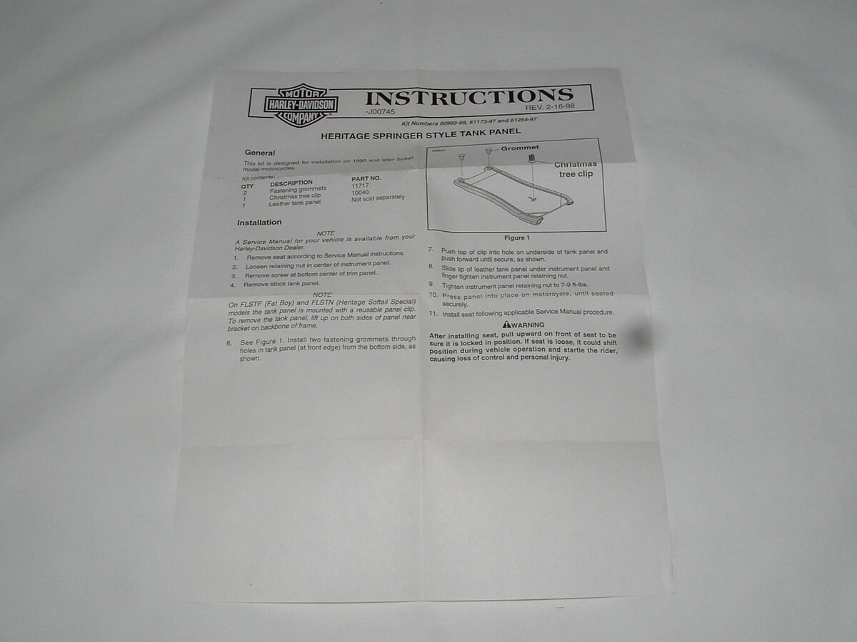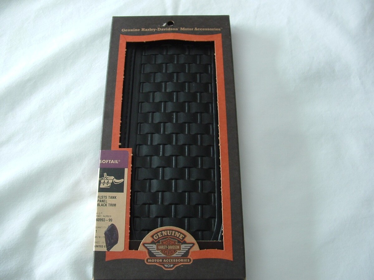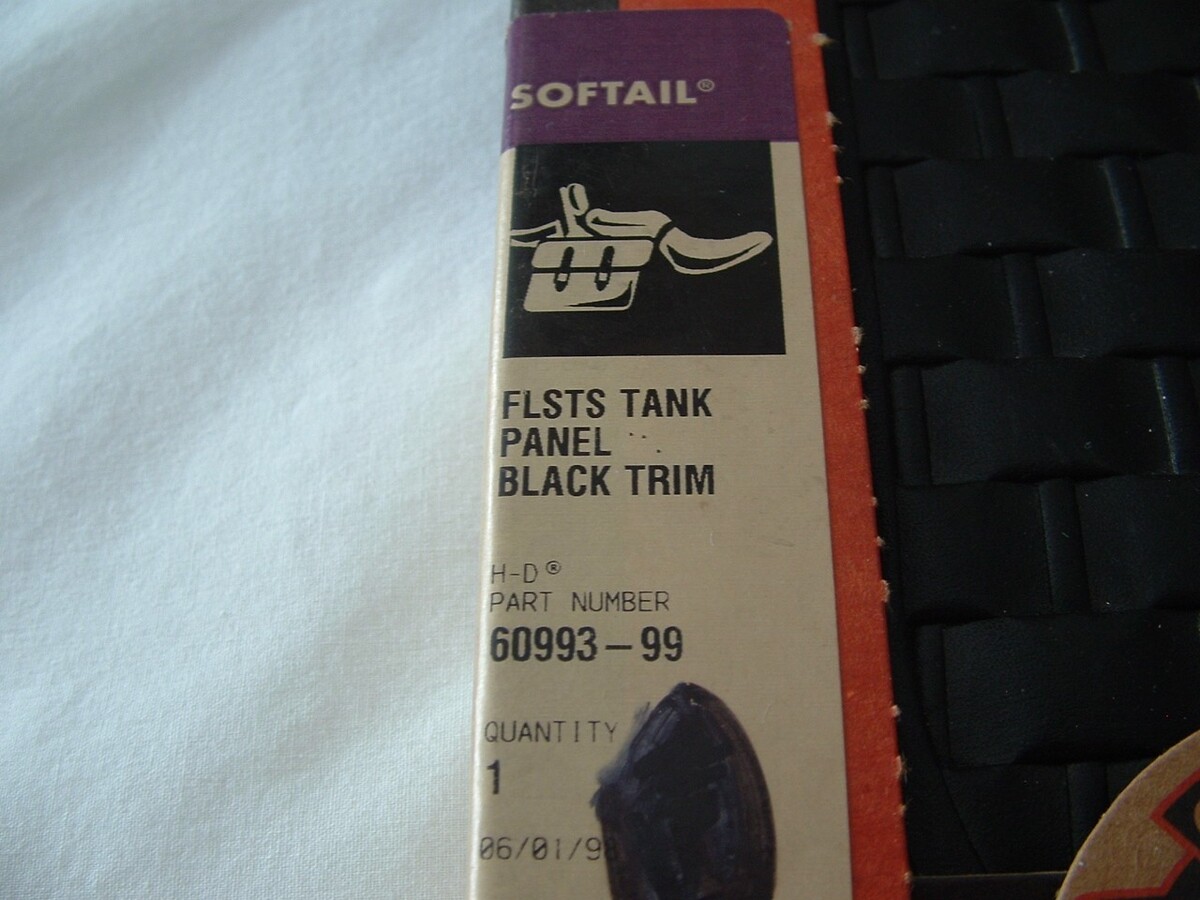 Harley FLSTS Heritage springer tank panel. Black trim. Part number 60993-99. This is NEW. I opened the box for pictures. Long time obsolete part. Fits 1990 and up softail models. Don't know how far up in model years this will fit. Do your home work to be sure this will work for you. I have 11 of these panels. If you want to deal on the whole lot let me know. FREE shipping to the lower 48.