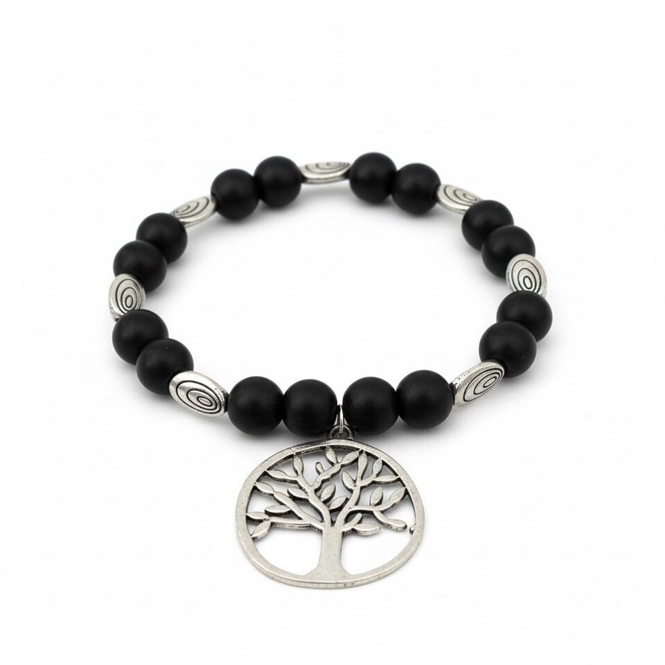 Handmade tree of life beaded bracelet. Black beads with silver spacer beads. Tree of life pendant adds a nice touch. Looks great stacked with other bracelets.