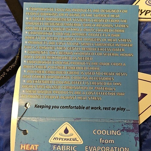 Stay cool on those long summer days. Helps combat heat stress. Lightweight, durable, reusable, and washable. Many more applications for hot outdoor activities like construction work, sporting events, fishing, boating, and extreme sports.