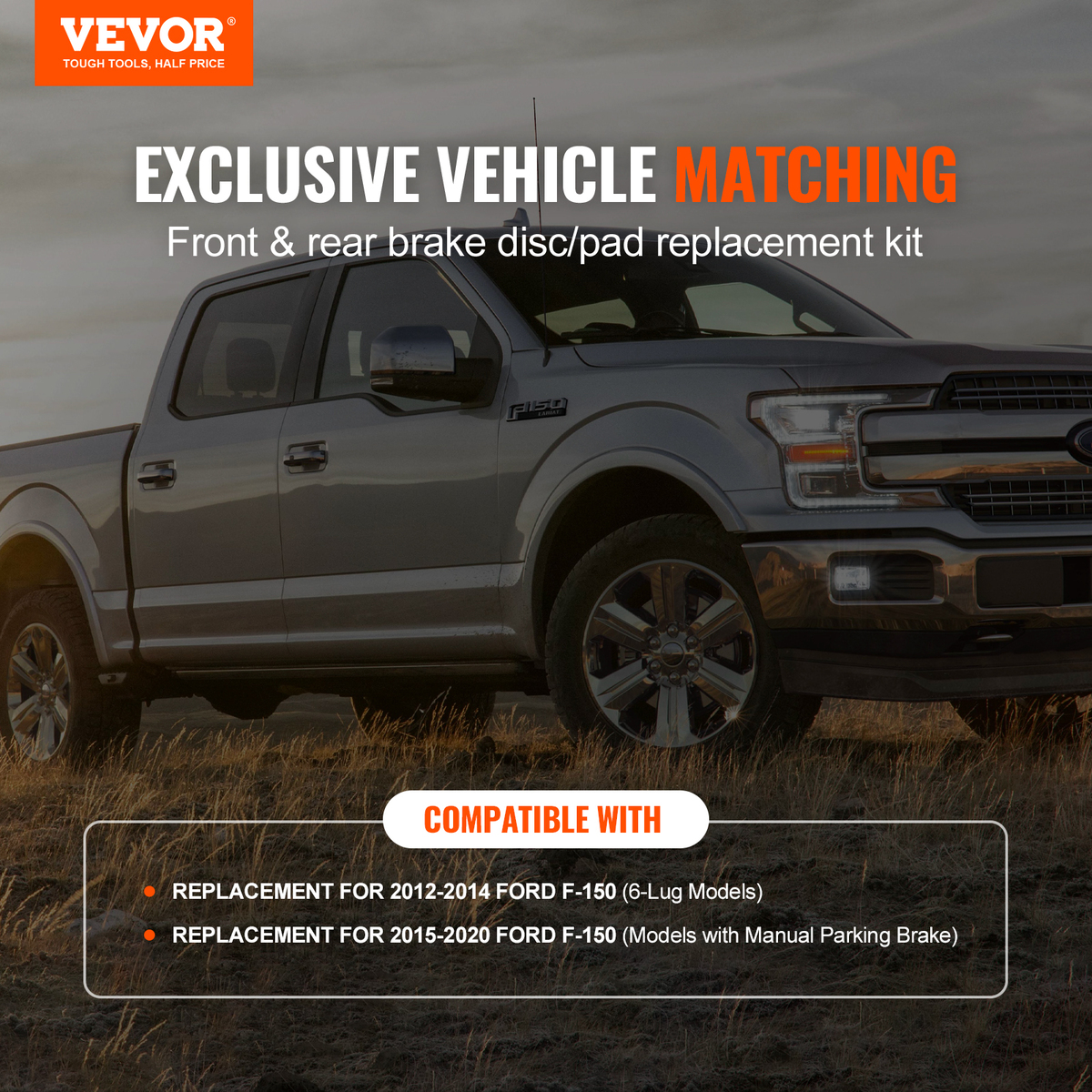 Vehicle Compatibility: Complete front and rear brake kit includes 2 front rotors, 2 rear rotors, 4 front brake pads, and 4 rear brake pads. The front rotor dia.: 13.8"/350 mm, and the rear rotor dia.: 13.7"/348.2 mm. Compatible with 2012-2014 Ford F-150 (6-Lug Models), 2015-2020 Ford F-150 (Models with Manual Parking Brake).