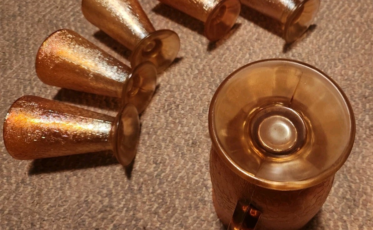 VTG Jeanette Marigold Crackle Carnival Glass Footed Pitcher & 5 Glasses Set