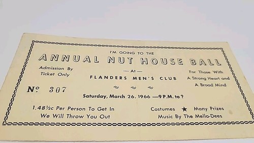 This vintage 1966 Flanders Men's Club Annual Nuthouse Ball Ticket Stationary is a must-have for collectors of historical memorabilia. The ticket stationary is a unique piece that captures the essence of the Flanders Men's Club and the Nuthouse Ball event. It features the year 1966, and is not signed.