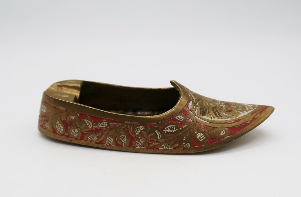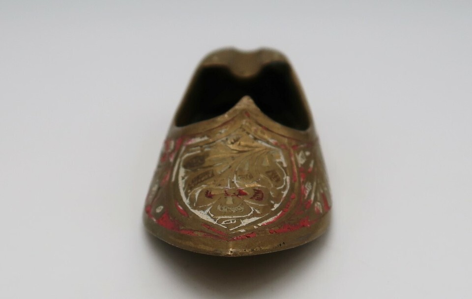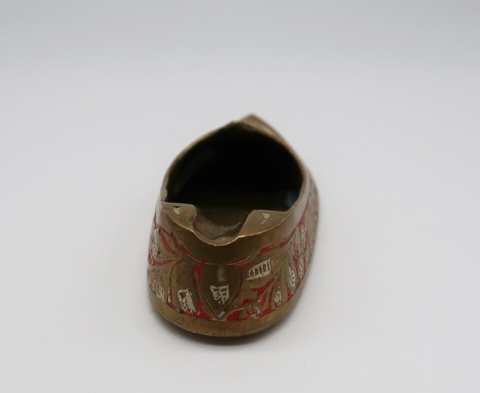 Vintage brass engraved floral shoe ashtray made in India pink enamel accents