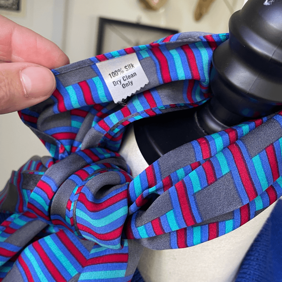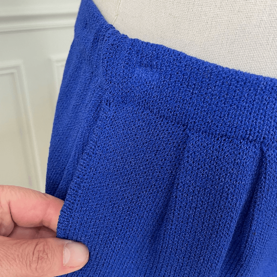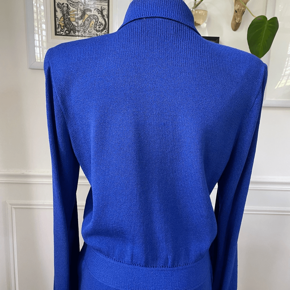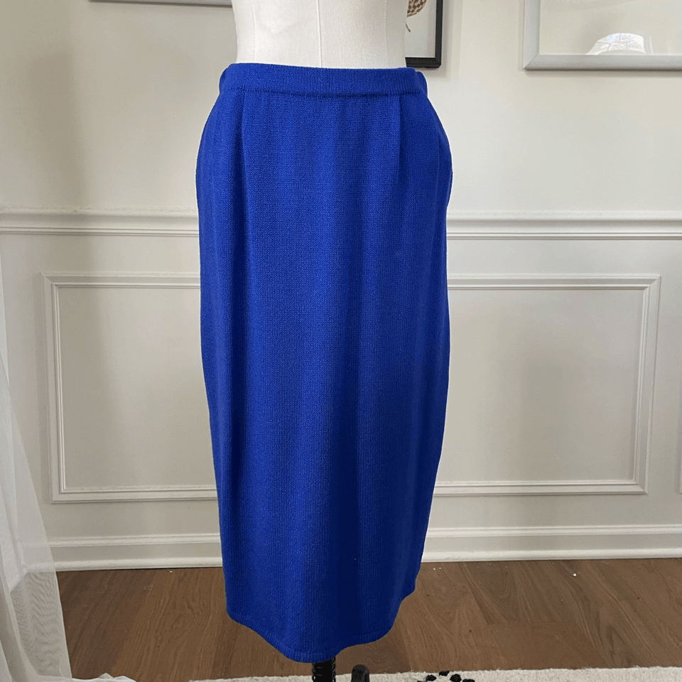 Vintage St. John for Saks Fifth Avenue Santana knit cobalt blue skirt suit with gold tone buttons with matching blue accent in the center and a coordinating 100% silk scarf. The silk scarf is not branded and the edges are stitched. It measures approximately 46 inches long and just shy of 14 inches wide. Skirt has pockets and front pleats. It measures approximately 14.5 inches straight across the elastic waist and 26 inches long. The jacket has two large patch pockets at the chest and is banded at the bottom for a neat look. The jacket measures 20 inches shoulder to hem and 19 inches armpit to armpit when buttoned shut. All buttons are accounted for. Tag size 10, but that is vintage sizing and in my opinion this is closer to a modern size size medium and featured size medium dress form where it fits well. No holes, no pulls. It?s a beautiful suit