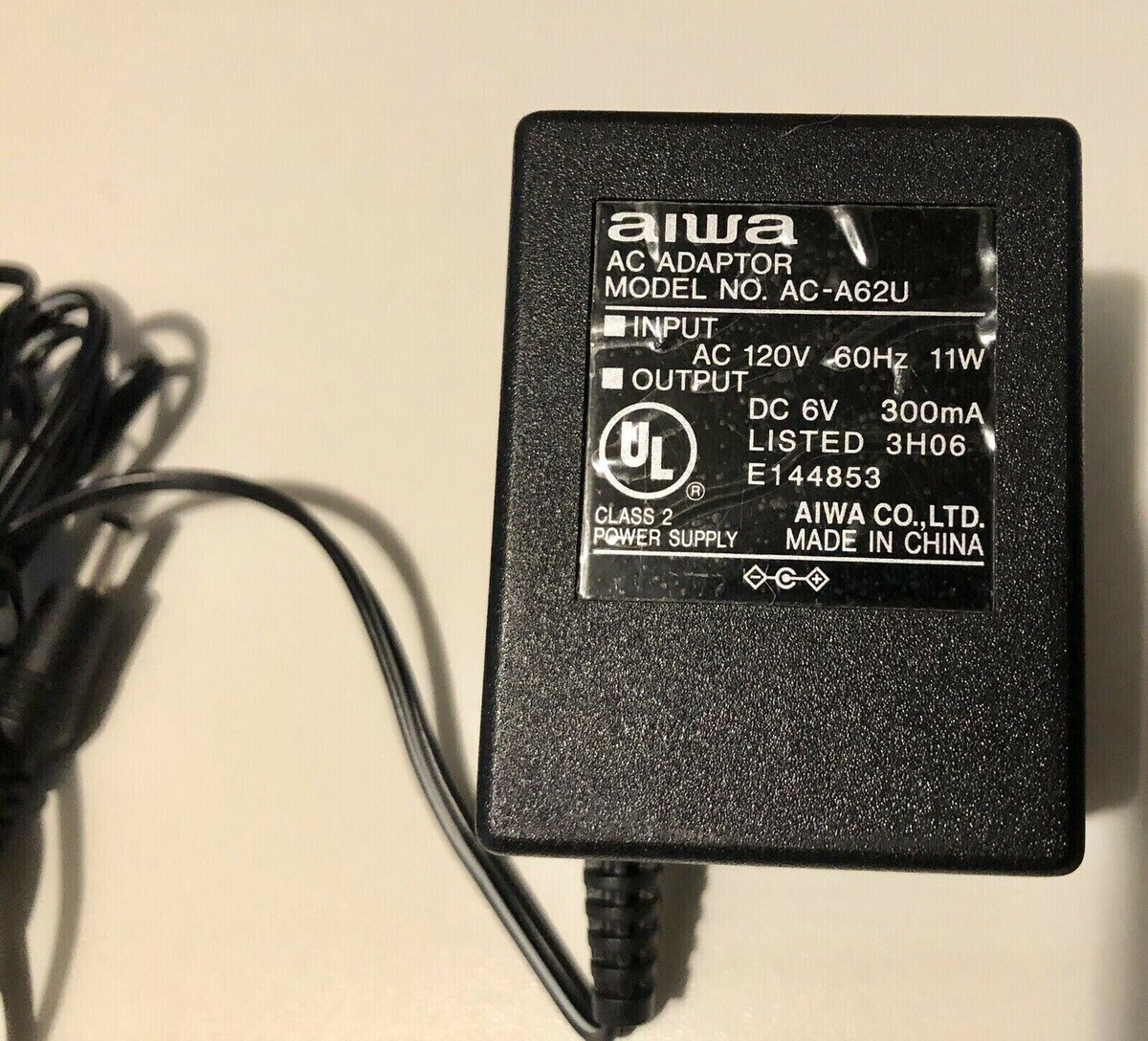 AIWA AC Adaptor Model AC-A62U Input AC 120V 60Hz Output DC 6V 300mA OEM