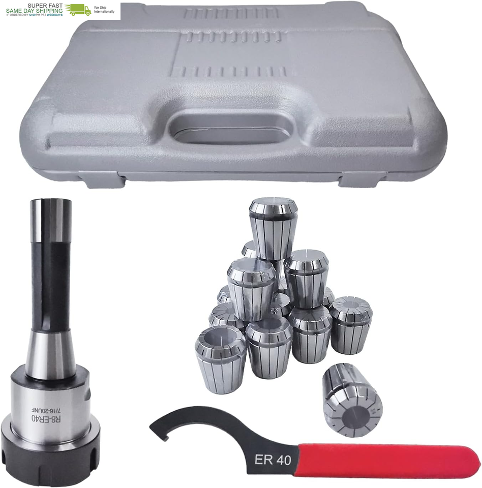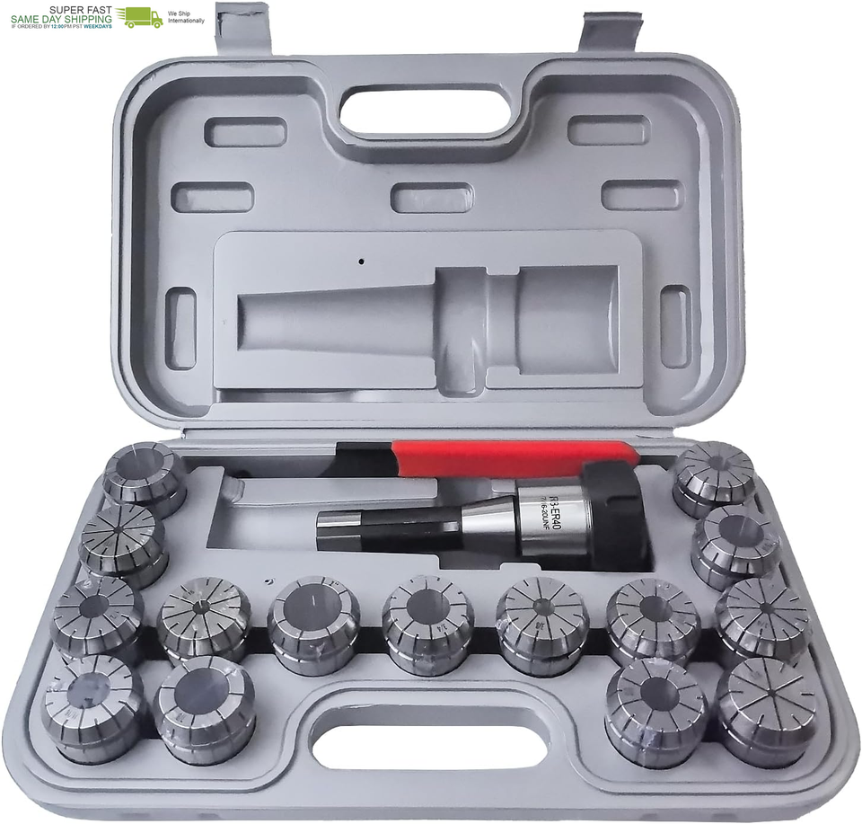 Package Includes: 1 PC R8-ER40 Shank Threading (7/16"-20), 15 PCS ER40 Collets, 1 PC ER40 Wrench, and 1 PC Plastic Case