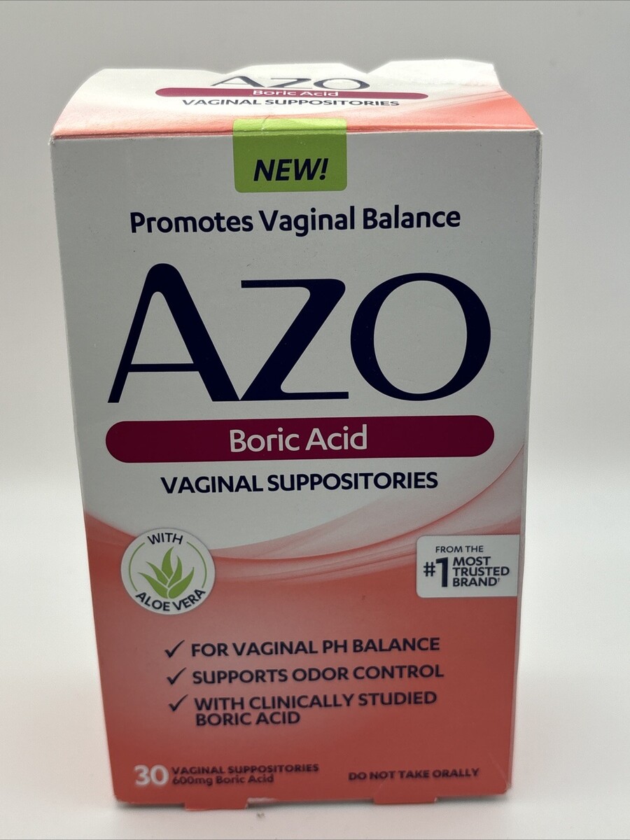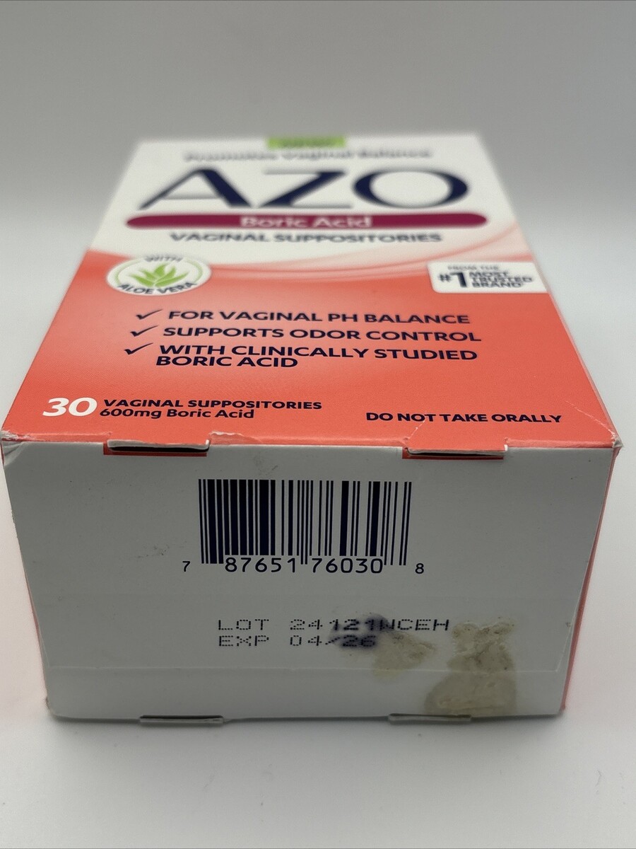 Open Box - AZO Boric Acid Vaginal Suppositories 600mg PH Balance 30 Count Exp 04/27. Package may contain shelf ware , retail stickers or cosmetic imperfections