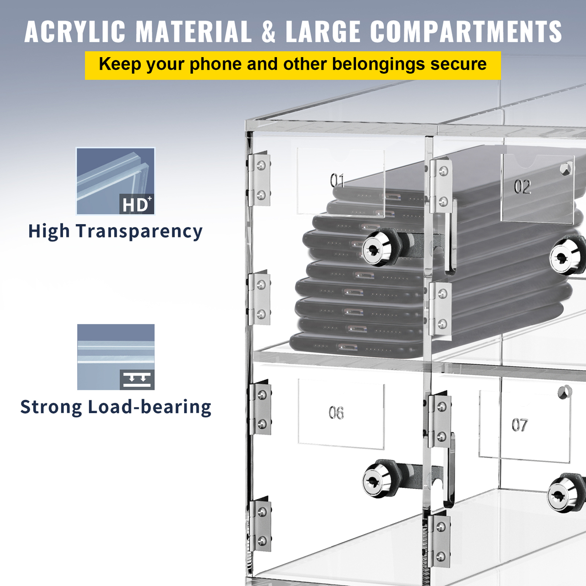 Clear Acrylic Large Capacity: Our cell phone locker is made of high-quality acrylic, which is not easy to deform and guarantees a long service life for the cabinet. Each slot measures 3.9" W x 7" D x 3.9" H. The compartment size is suitable for 99% of mobile phones on the market. Securely hold your phones, wallets, and other belongings.
