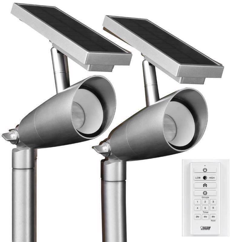 Feit Electric's OneSync SPOT/SYNC/SOL/NK/2/4 Starter Kit combines bright solar light, durable construction, and customizable control like never before. Each kit includes two 8-inch spotlights and wireless remote control. Their 100-lumen output is 3x brighter than traditional solar lights. LED technology delivers up to 10,000 hours of life. Weather-resistant, each heavy-duty light kit is backed by a 3-year warranty. Select from five shades of white (2700K, 3000K, 4000K, 5000K, and 6500K) or 8 colors to set your desired mood. Its built-in dusk-to-dawn light activates once the sun goes down and stays lit for up to 8 hours. Place them where you like and ensure the solar panel gets plenty of sunlight. No wiring is required. For wireless control, hold the button on the light and press the group button on the remote. Create up to 6 lighting groups. Set timers to customize your landscape for parties, holidays, and more. OneSync comes in a stylish nickel finish adding a modern look to your home. Easy installation means you never have to dig up your backyard or hire a professional. OneSync outdoor lights sync within 100 feet of each other for unlimited total range. For even more flexibility, pair with the OneSync Landscape Smart Wi-Fi Bridge (sold separately) to control lights from your phone or smart device. Experience the glow as far as you can go. The days of subpar solar are over.