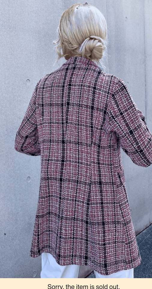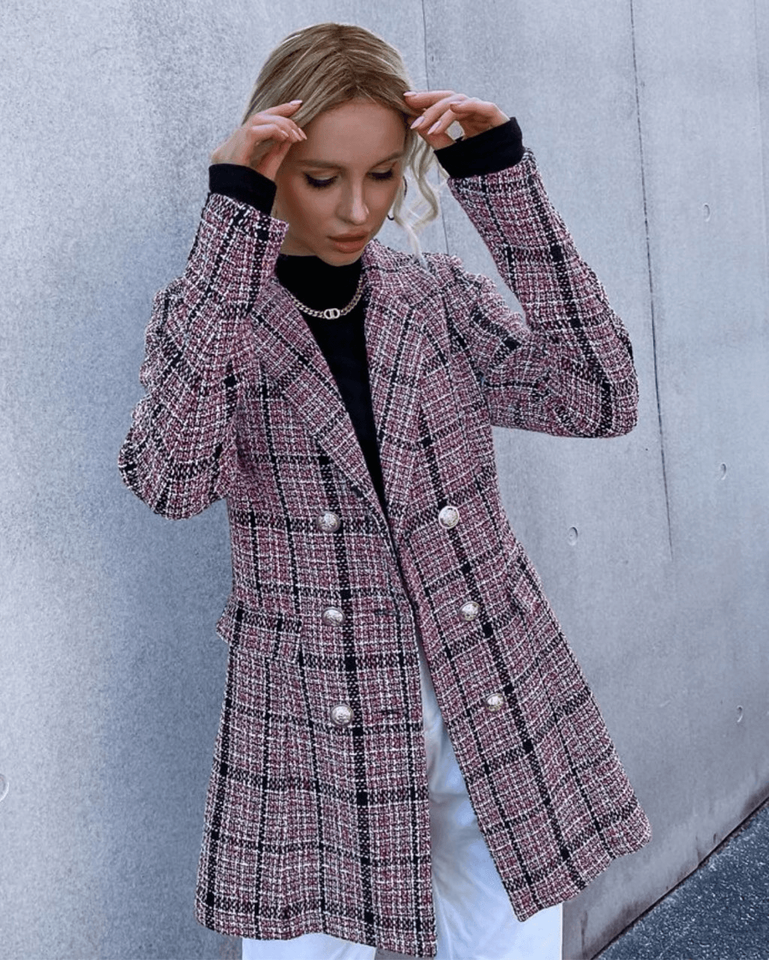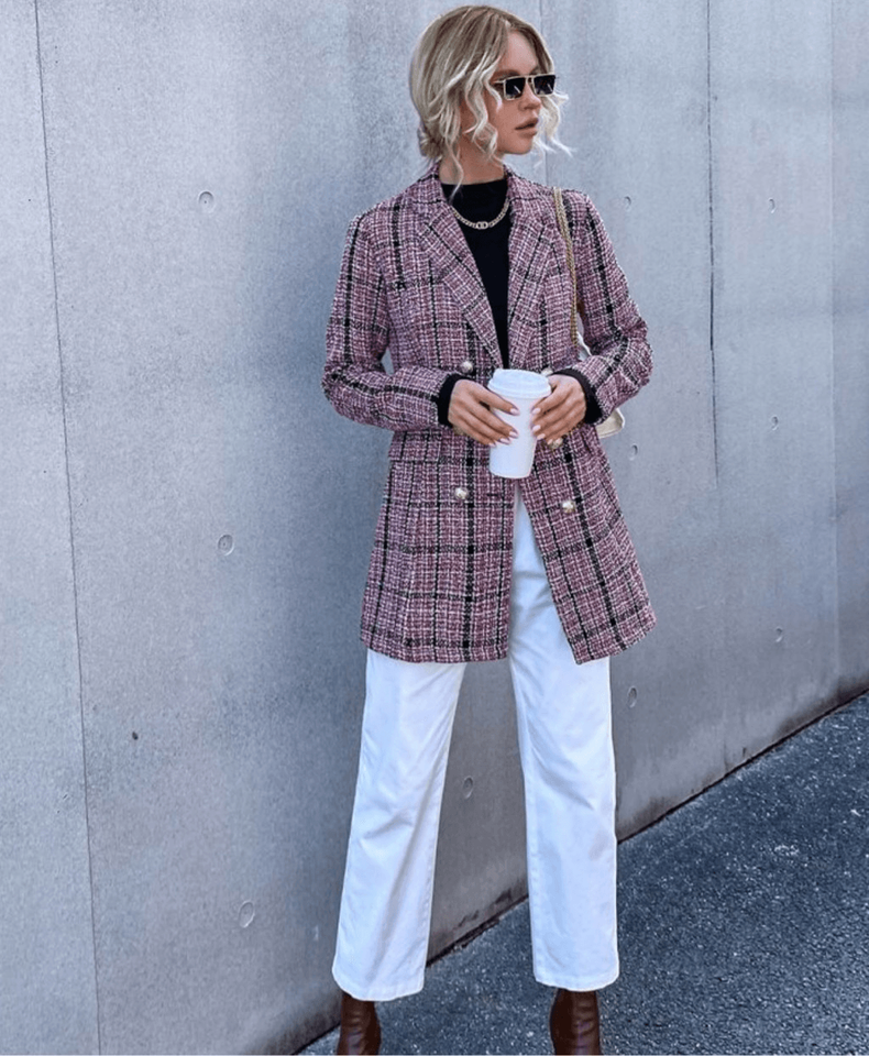 Plaid Pattern Flap Detail Double Breasted Tweed Blazer