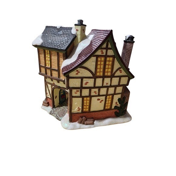 Craft a charming holiday scene with this delightful Christmas village "Cricket Inn" buildings. The detailed structures evoke a cozy winter atmosphere with their snow-dusted rooftops, warm glowing windows, and festive holiday decorations. The "Golf Shop" stands tall with its distinctive turret and inviting storefront, while the "Cricket Inn" offers a classic Tudor-inspired charm with its timbered facade and quaint entrance. Perfect for creating a magical display on your mantelpiece, shelf, or as a centerpiece for your holiday table.