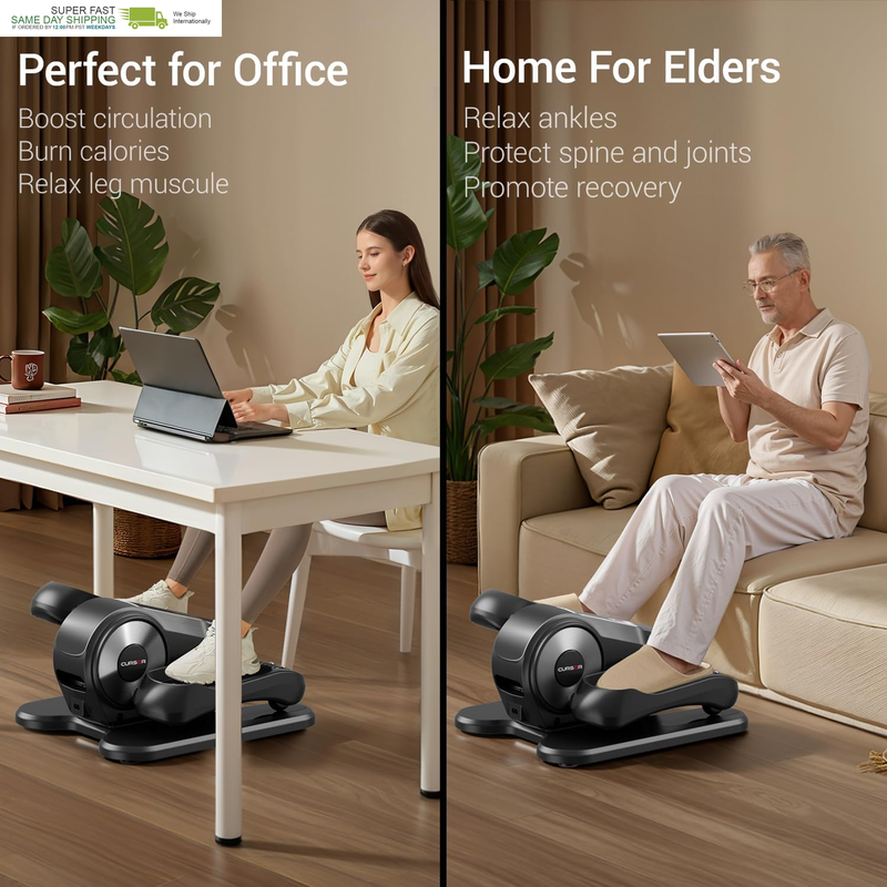 Under Desk Elliptical: Boost your productivity while staying active! Meet our essential elliptical for seamless workouts or rehabilitation, all from your home or office chair. Whether working, reading or watching TV, turn sitting time into an exercise opportunity with this innovative pedal exerciser, which keeps your legs flexible with our elliptical exercise machines