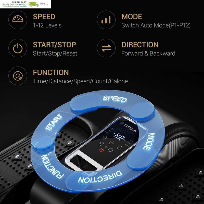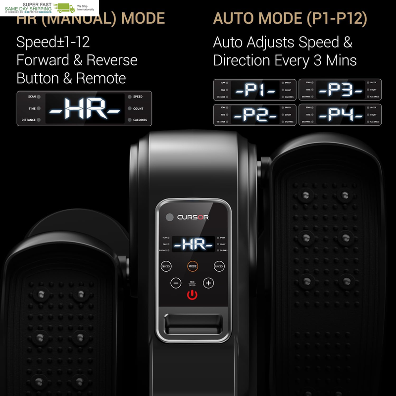 HR Auto Mode: Exercise anytime, anywhere. In HR(Manual) mode, you can adjust workout time(15-30min), speed(1-12) and direction (forward reverse) by remote control or button of the elliptical machine. Then switch "mode" to Auto mode that the speed and direction have been programmed. In auto mode, you can adjust P1-P12 mode by press mode button, the speed of the mini seated elliptical changes every minute, and the direction changes every 3 minutes