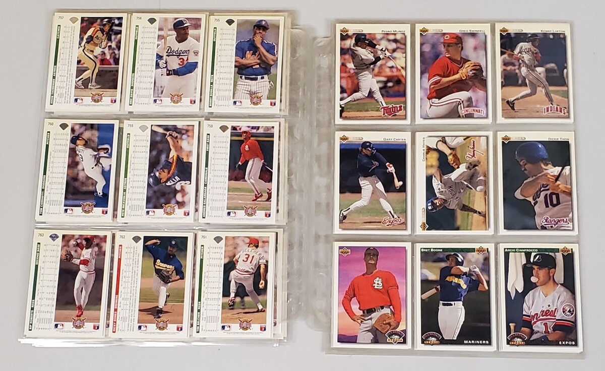 Also includes many high-series player cards (#700s) from 1991 Upper Deck featuring stars and solid players such as Pedro Muรฑoz, Greg Swindell, Kenny Lofton, Gary Carter, Dickie Thon, Bret Boone, Archi Cianfrocco, and others from teams like Twins, Reds, Indians, Expos, Mariners, Angels.