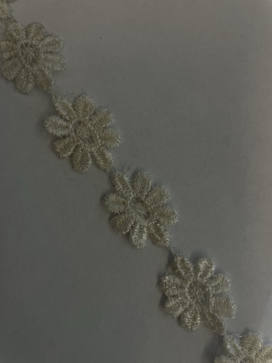 You may use per yard or cut each flower . This product is a 4-yard lot of natural daisy Venice lace trim, measuring 7/8" in width. It is made of guipure lace material and features a flower shape, ideal for various crafting and sewing projects. The lace trim is suitable for uses like blankets, saris, drapery, upholstery, lingerie, hat/millinery, headbands, and wedding dresses, adding a touch of elegance and detail to these items. Its natural color and intricate design make it a versatile and aesthetically pleasing embellishment for a wide range of creative endeavors.