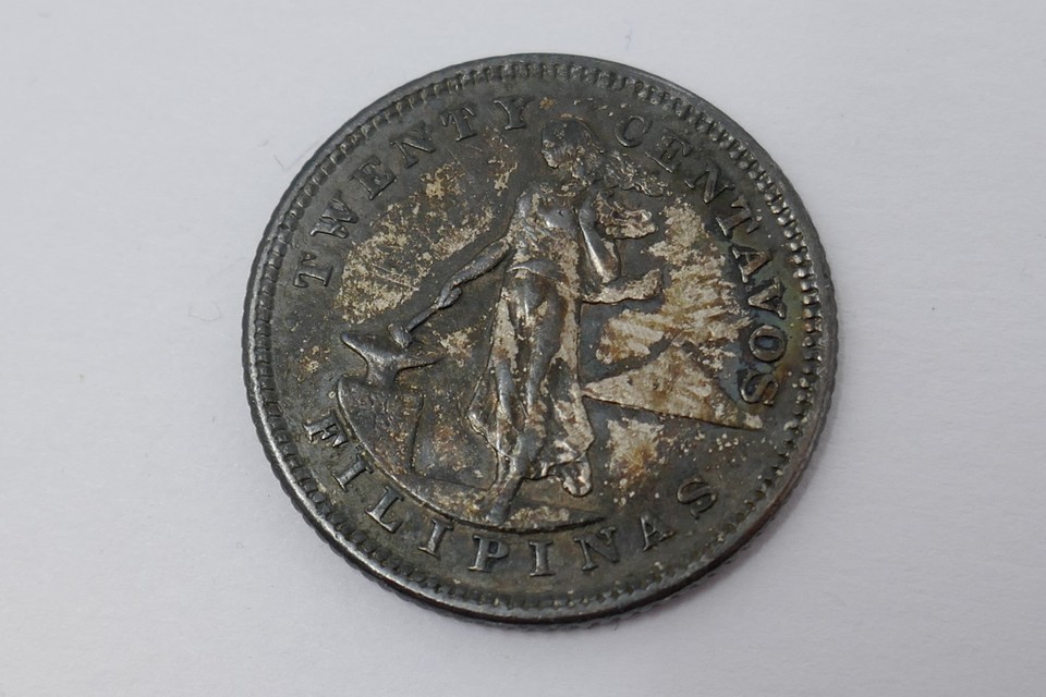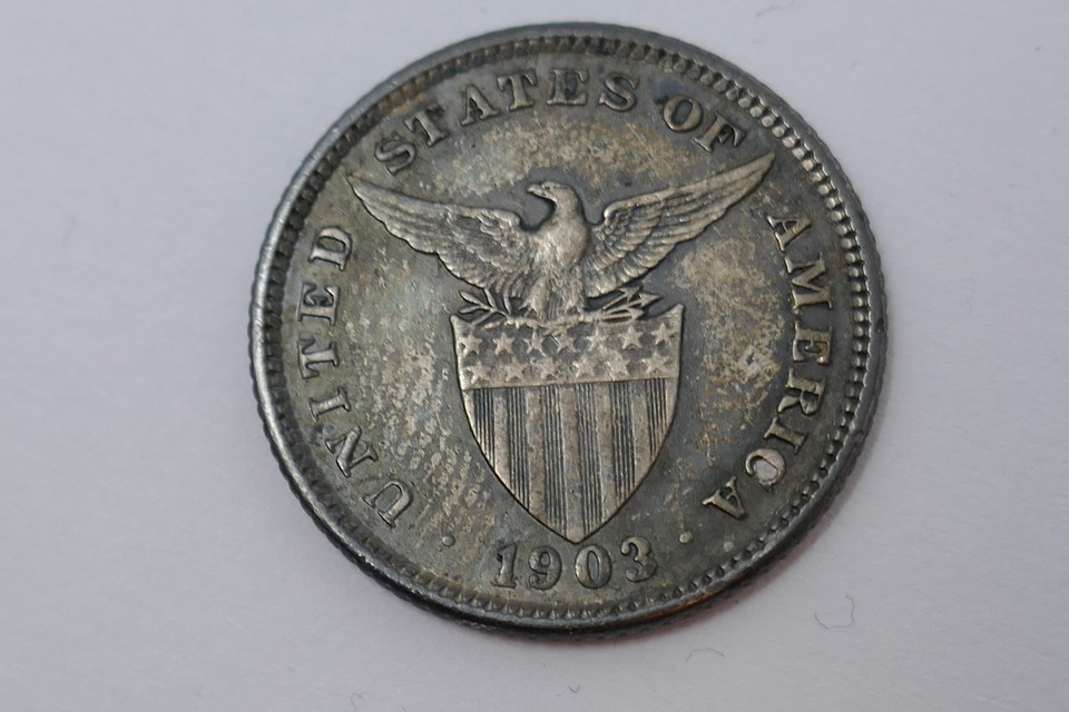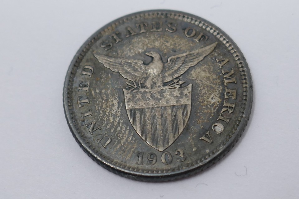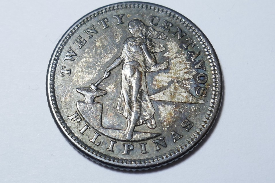 This is a 1903 Philippines 20 Centavos silver coin with a fineness of 0.9. This coin belongs to the historical period of the U.S. (1898-1946) in the Philippines. It is an ungraded, uncertified coin with a KM Number of 166. This large type silver coin is a collectible piece from the Philippines that holds historical significance and value for numismatists interested in coins from this era.