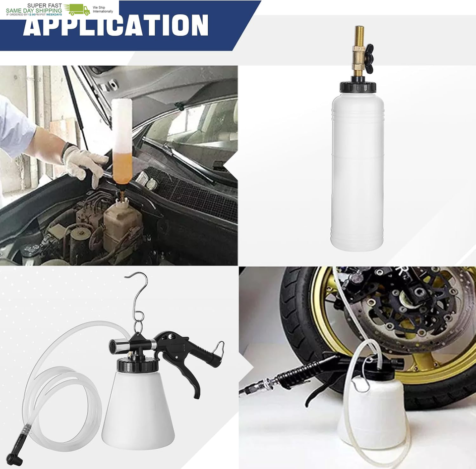?APPLICATION?Brake jobs are some of the most common vehicle maintenance jobs that can be done at home; This Brake Fluid Bleeder Kit includes everything you need to quickly and easily remove air from your brakes without creating a mess; Rather than waiting hours for gravity to bleed your brakes, get this simple brake fluid tool to bleed your brakes in minutes.