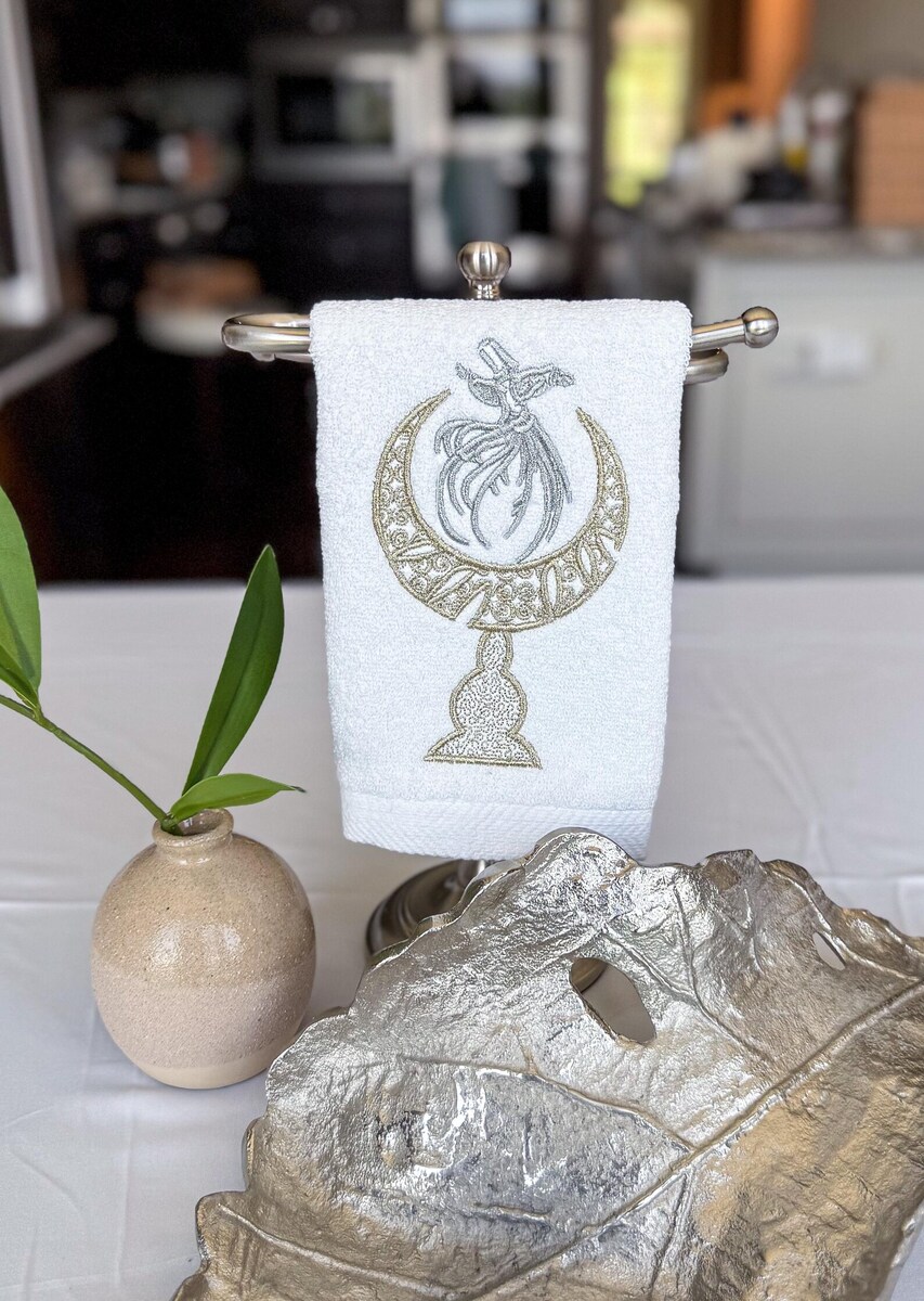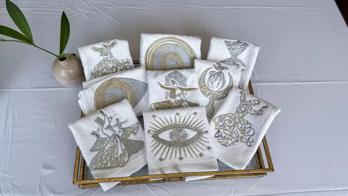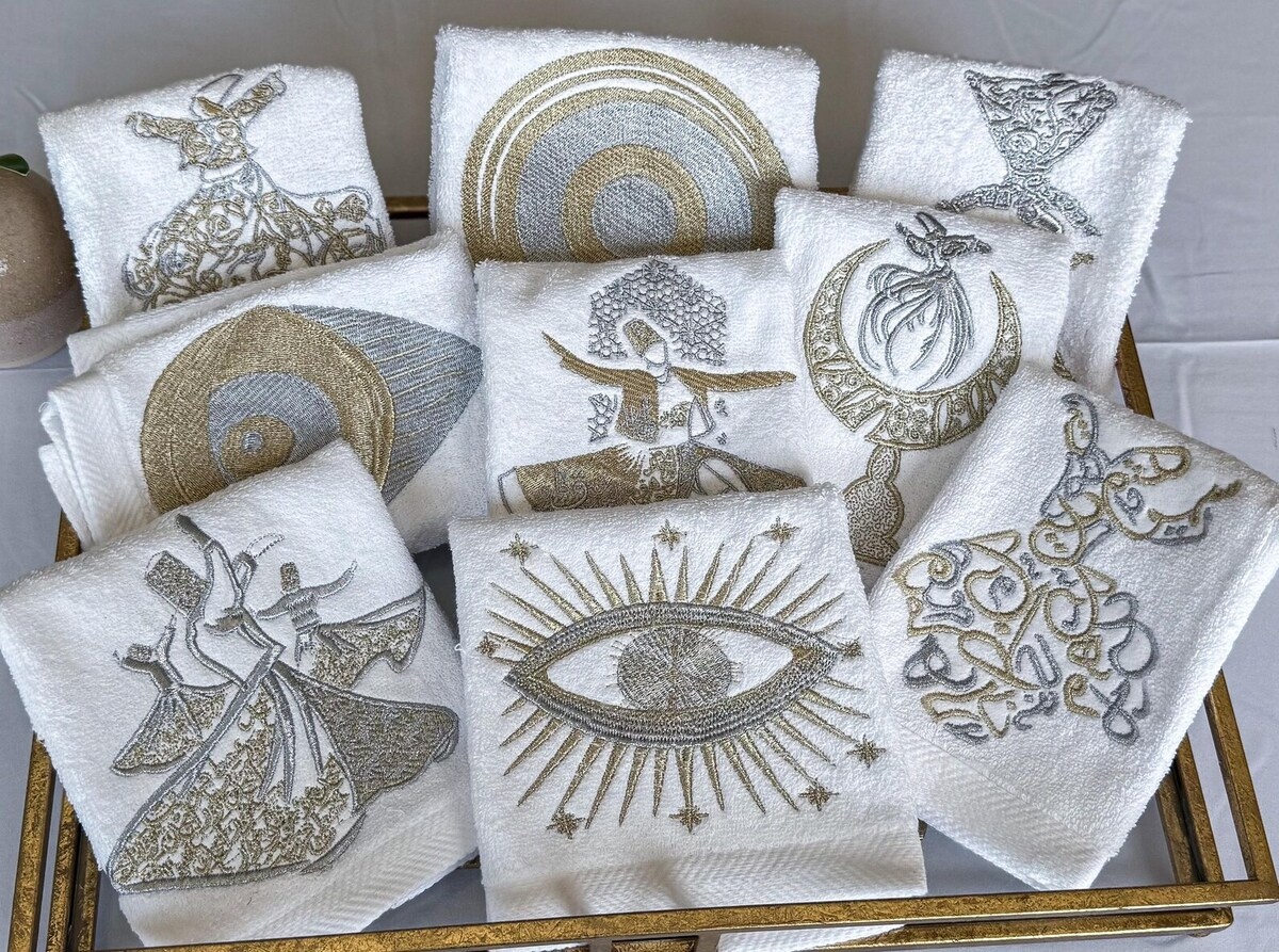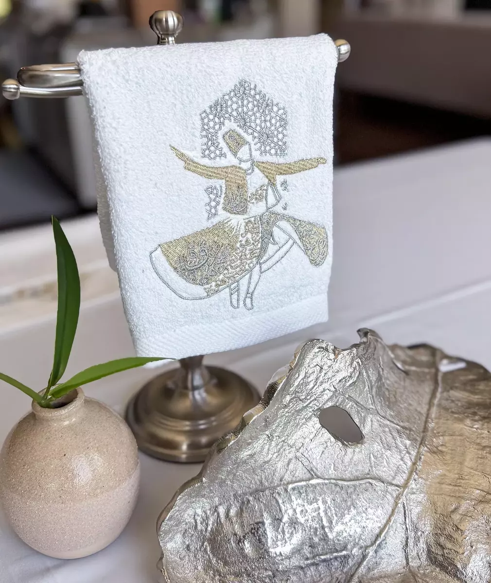 Add a touch of elegance and culture to your home with this premium 100% cotton guest towel, featuring a detailed whirling dervish design in shimmering gold and silver embroidery. A graceful and symbolic piece, perfect for elevating your guest space or gifting something truly unique.