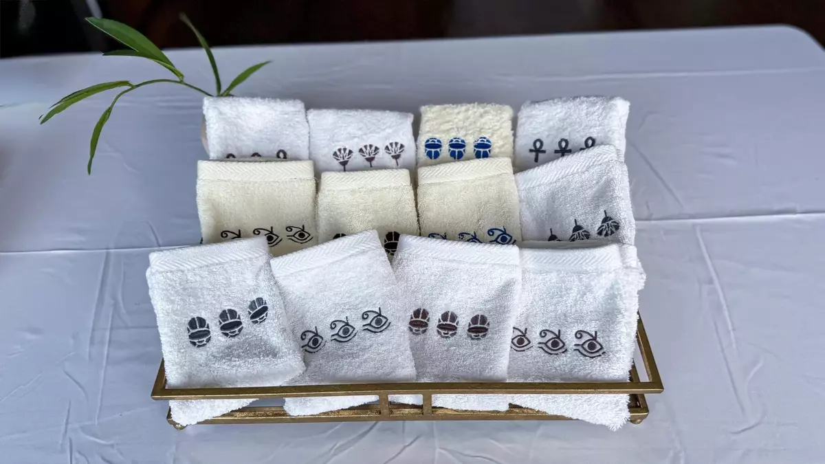 This towel is made with 100% natural organic Egyptian cotton. Perfect as a hand towel for your guests in your powder room. Natural colour 100% organic Egyptian cotton Approx. 30 x 30 cm Made in Egypt 100% Egyptian cotton towels that each have a unique design. For this particular item, there is 1 egyptian themed graphic on each towel. The graphics are in various shades of blue placed on a cream towel base. Towels are soft but become softer after the first wash :) I work closely with a shop to bring designs to life. Inspirtation has been drawn from the various shops in the Khan El Khalil loctaed in Cairo, Egypt. Elevate your daily routine with our Pharaonic Towel, featuring intricate Pharaonic embroidery. Crafted from 100% natural organic cotton, this hand towel combines luxury and functionality. Key Benefits: Authentic Pharaonic Embroidery: Showcasing exquisite, detailed Pharaonic designs that add a touch of elegance to your bathroom decor. 100% Natural Organic Cotton: Made from the finest organic cotton, offering superior softness and absorbency. Eco-Friendly: Sustainable and environmentally friendly, this towel is gentle on your skin and the planet. Durable and Absorbent: High-quality materials ensure long-lasting use and excellent water absorption.