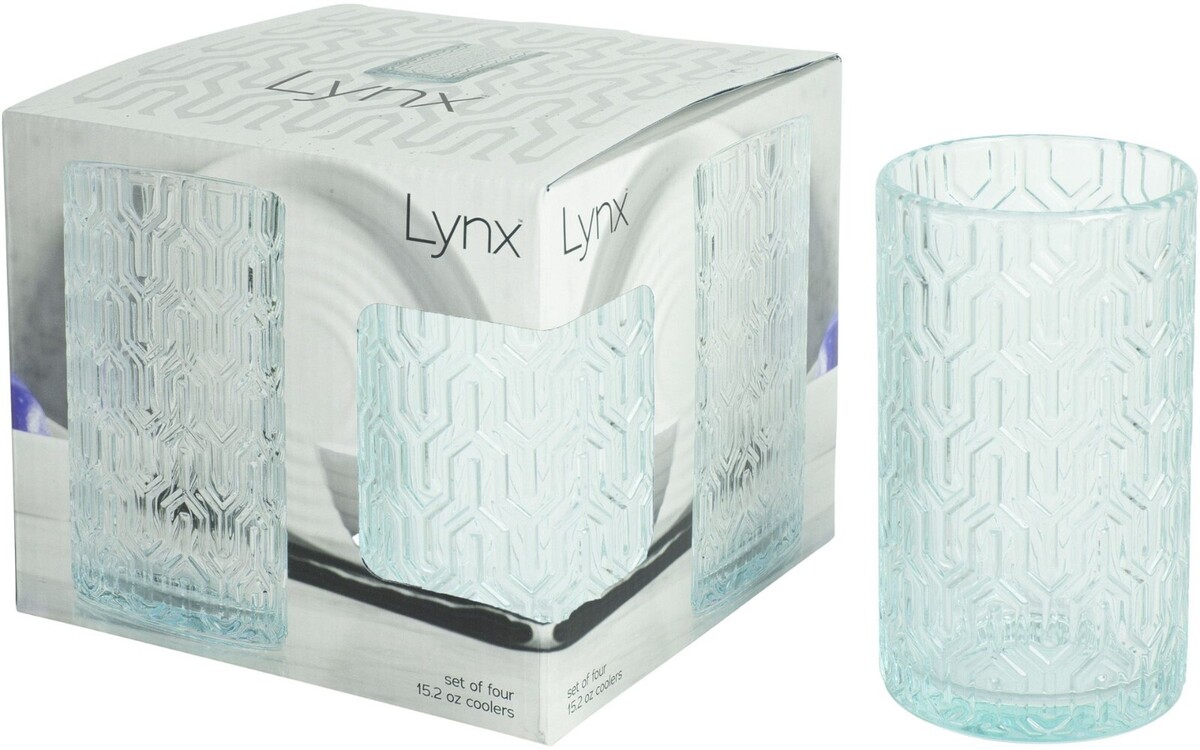 Elevate your drinking experience with these vintage/retro Lynx Hi Ball Tumbler Glasses. The round glasses have a capacity of 15 oz and come in a set of four. Perfect for all occasions, the blue glasses feature a Lynx pattern and are made of dishwasher safe glass.