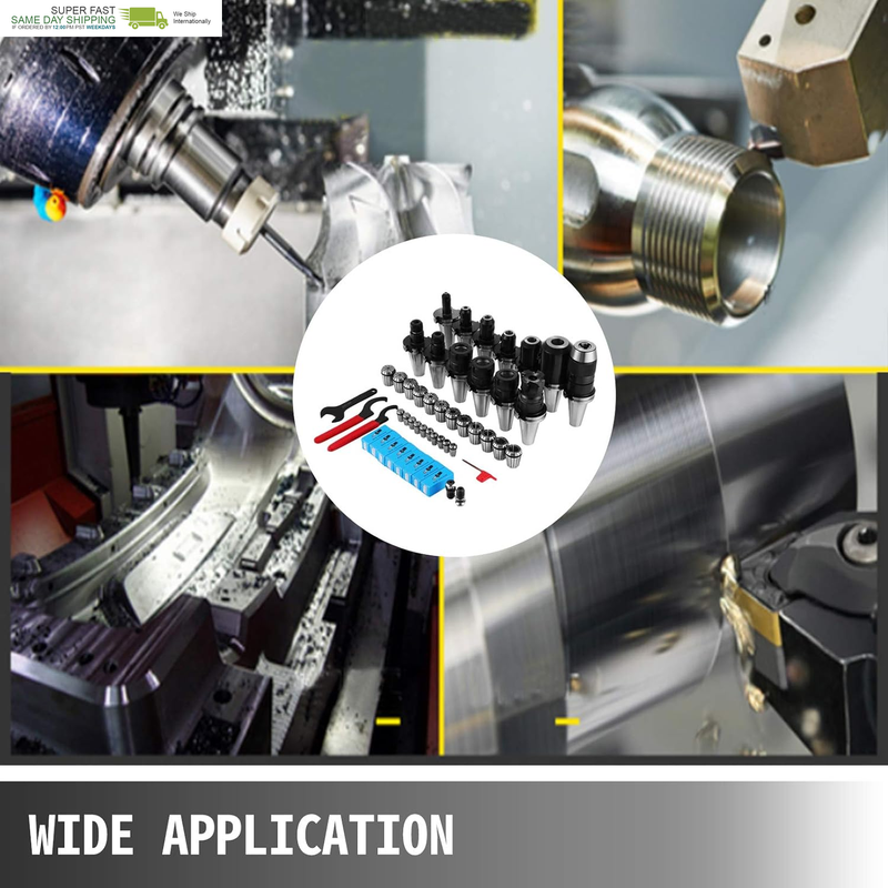 12pcs ER32 collets: 1/8"-3/4", 10pcs ER16 collets: 1/32"-3/8". High rigidity. T.I.R.: 0.0003" or 5um.