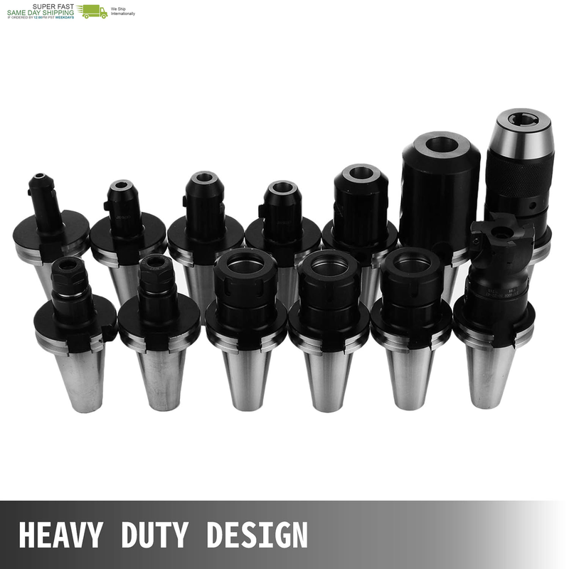 Set of 6pcs high precision CAT40 End Mill Holders, 3pcs ER32 collet chucks, 2pcs ER16 collet chucks, 1pcs Precision Keyless Drill Chuck, 12pcs ER32 collets, 10pcs ER16 collets and 10pcs HAAS pull studs, made of spring steel. Suitable for CNC Lathe/milling, drill press, and heavy duty hand tools. Featuring high accuracy and stable performance.