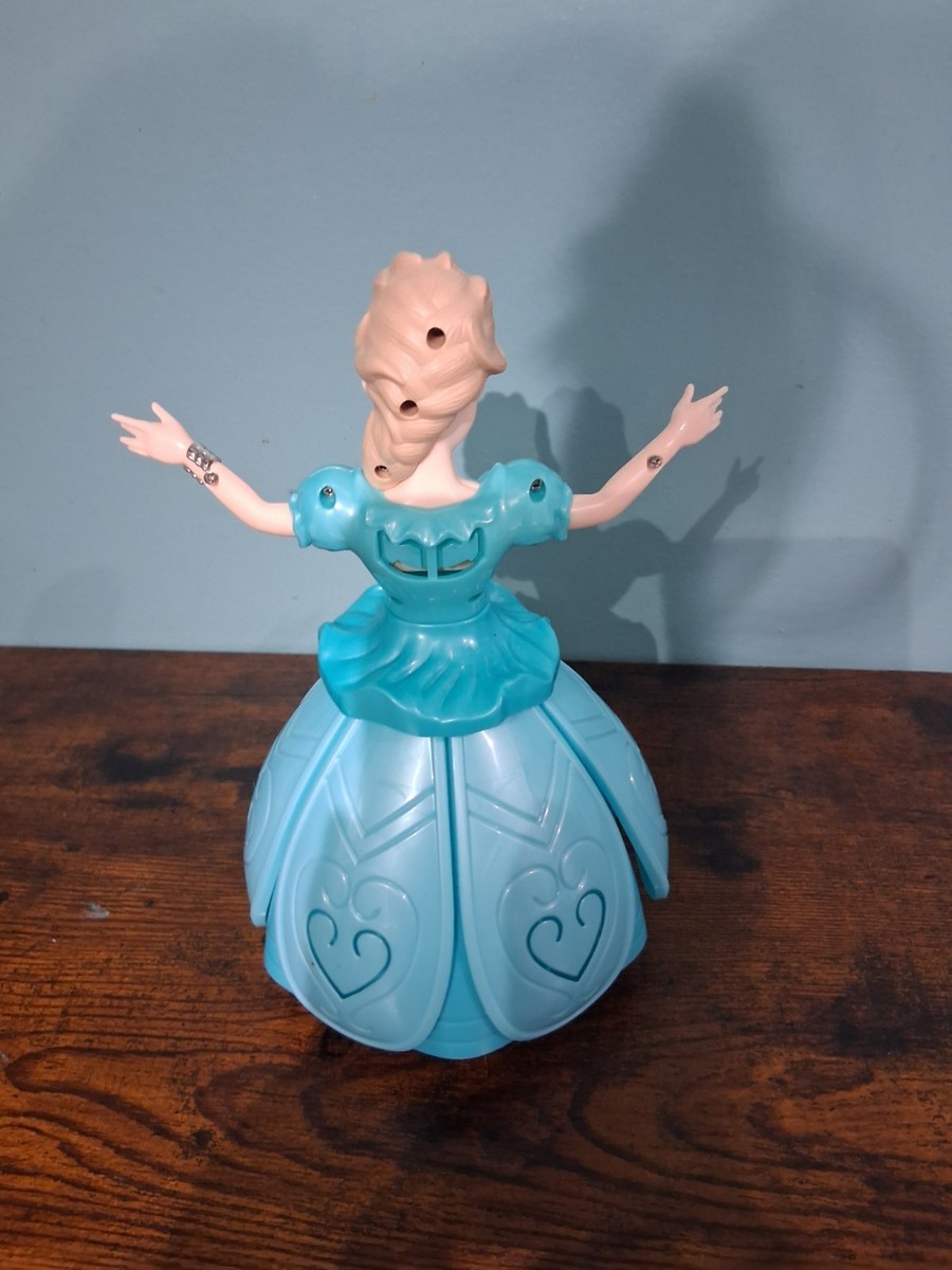 The Spinning Princess Doll is a replica of elsa from frozen.This plastic doll features blonde hair, straight hair, blue eyes, and a light complexion. The doll is designed as a girl doll with a Caucasian ethnicity, making it suitable for all occasions. Packaged in its original unopened box, this original doll is not antique or vintage and is not signed or personalized. It weighs 1 lb and is a great addition to any doll playset collection.