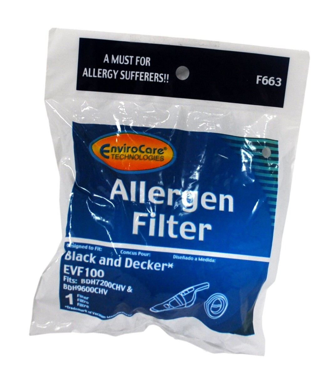Envirocare Allergen Filter Designed To Fit Black and Decker EVF100 Handheld Vacuum F663. Designed to fit: Black and Decker EVF100 Hand Vac. Fits: BDH7200CHV and BDH9600CHV. 1 Filter in package. Manufacturer Part Number: F663. SC-56-2329-03