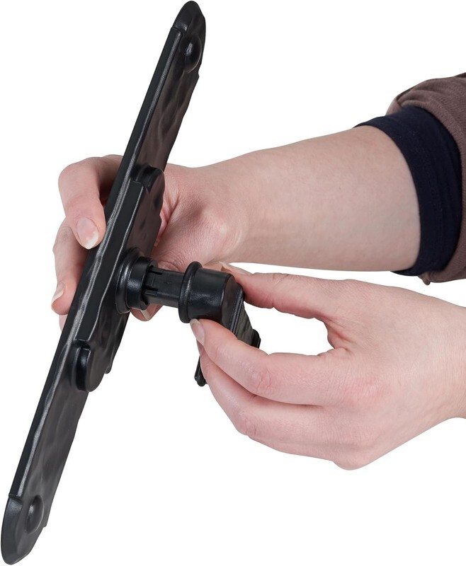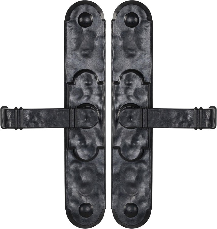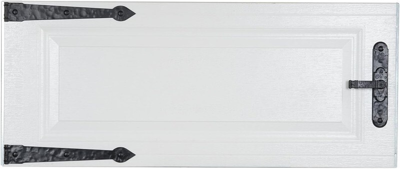With intricate details and a faux hammered metal look, these durable plastic pieces mimic the look of a classic carriage house door, complete with lever handles.