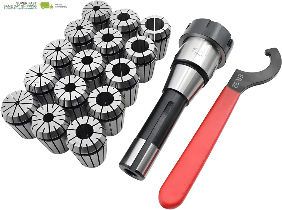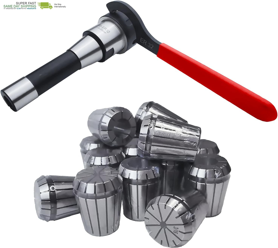 Package Includes: 1 PC R8-ER32 Shank Threading (7/16"-20), 15 PCS ER32 Collets, 1 PC ER32 Wrench, and 1 PC Plastic Case