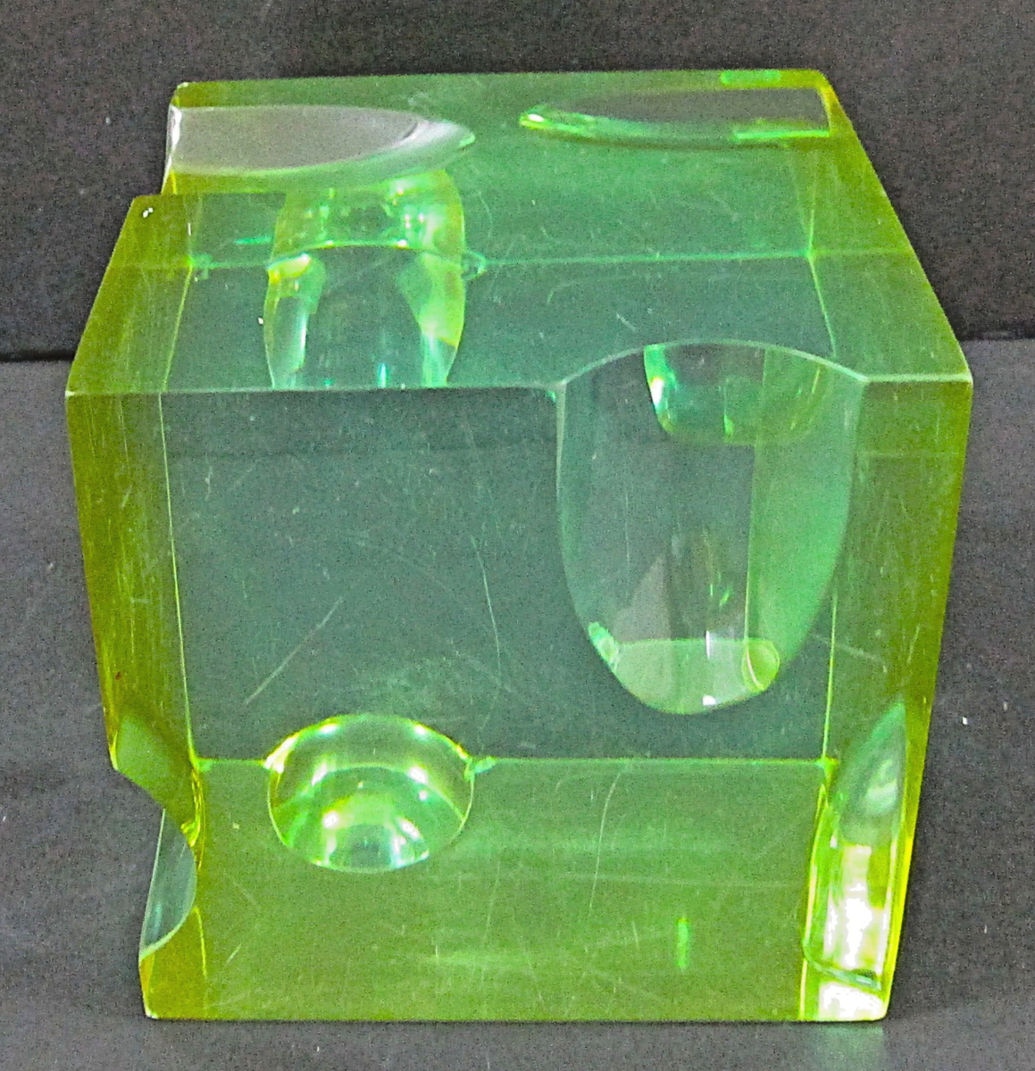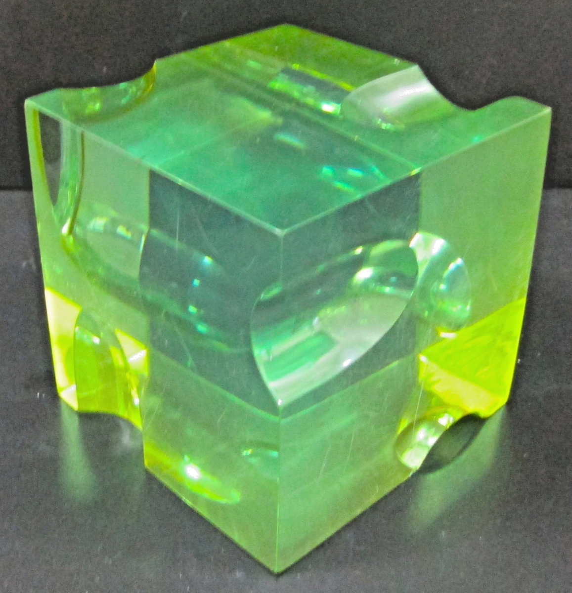 Mid-Century Roz Stroll Optical Light and Space Sculpture Green Lucite Cube