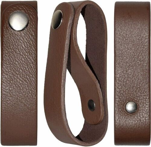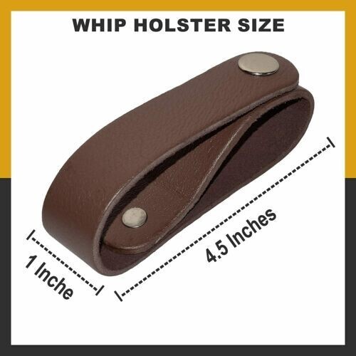 The brown whip holder measures approximately 4.5 inches in length and 1 inch in width, making it lightweight and easy to carry. The genuine grain leather belt loop is designed to fit most standard belts, allowing secure attachment and quick, easy access to your whip whenever needed.