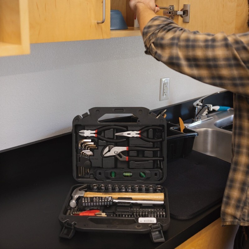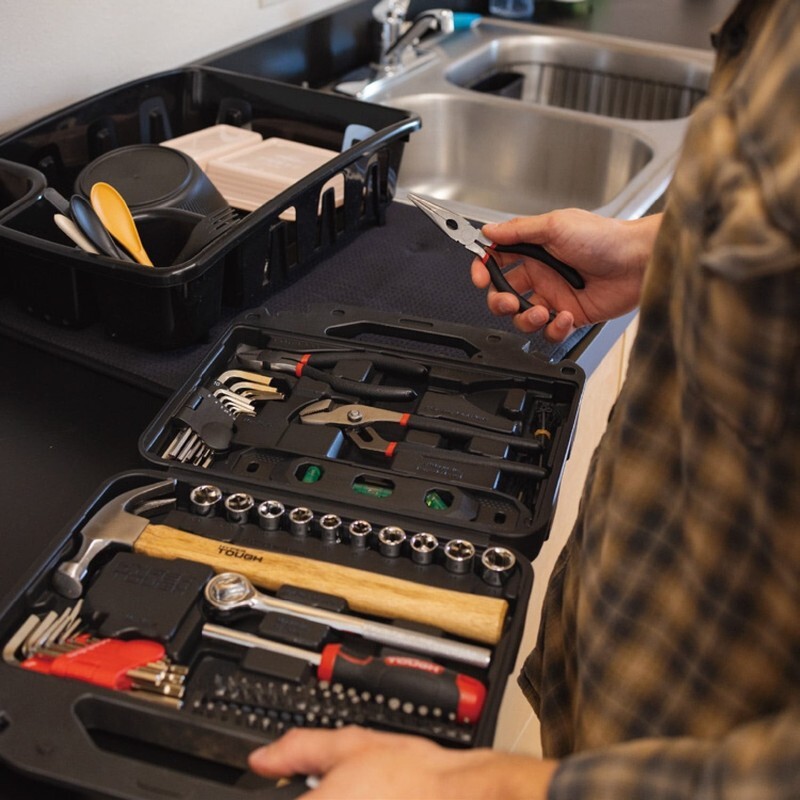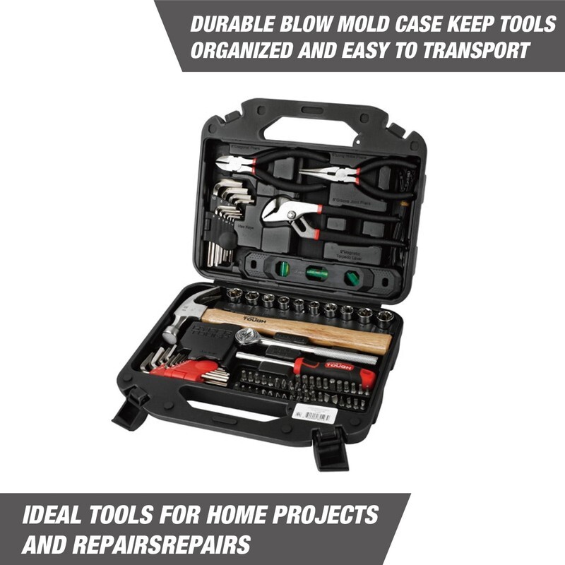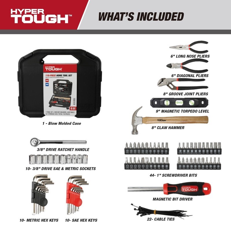 Hyper Tough 110-Piece Tool Set Includes a well-balanced 8 oz. claw hammer, 6" long-nose pliers, 6" diagonal pliers, and 8" groove-joint pliers ? perfect for gripping, cutting, and general repairs A durable 9" magnetic torpedo level ensures accurate alignment on every project 3/8" Drive Ratchet Handle with quick-release for easy socket changes 10 CR-V Sockets for both SAE and metric fasteners Ergonomic magnetic bit driver with comfort grip for easy control Includes 44 1" assorted bits for driving and repairs 4 screwdriver bit rails keep bits organized and accessible 22 Hex Keys in both SAE and metric sizes Comes with 2 sturdy hex key holders for quick identification and storage 22 cable ties to keep wires and cords neatly bundled Heavy-duty storage case with molded slots to keep tools secure and organized Perfect for everyday home repairs, DIY projects, apartment or dorm tool kits, gift for new homeowners or students
