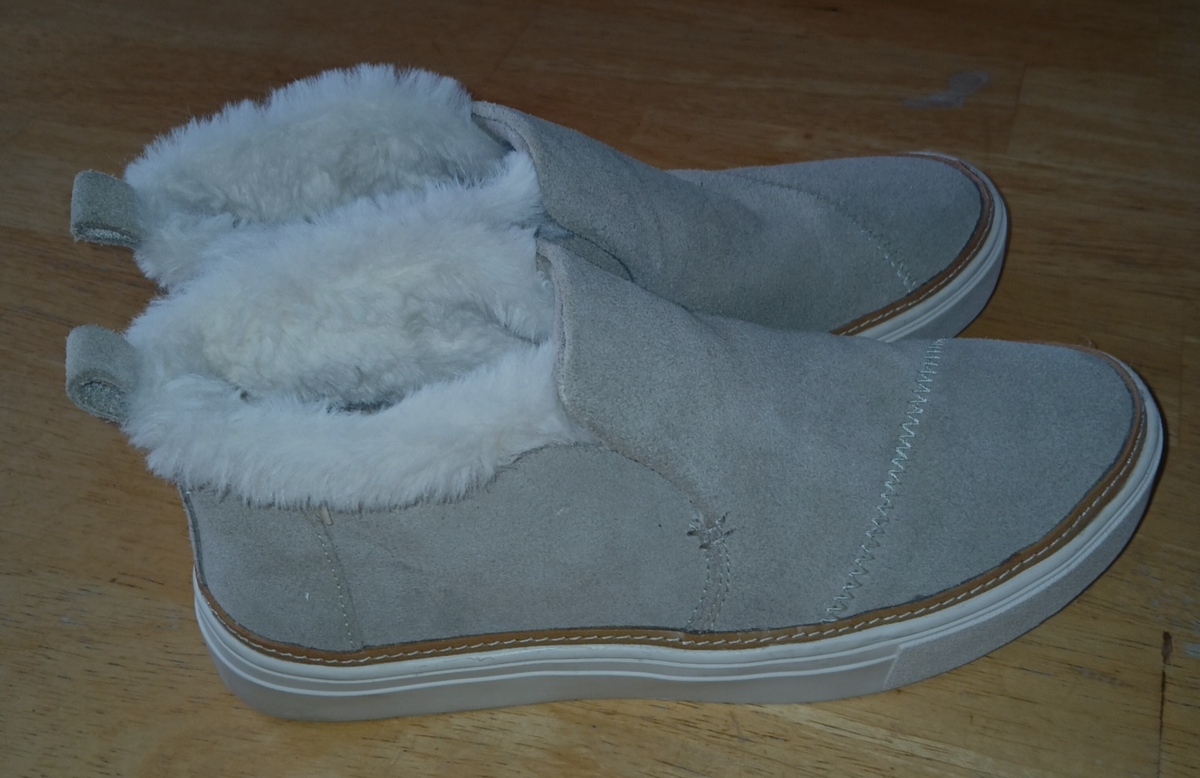 THIS IS A GREAT PAIR OF LADIES TOMS "PAXTON" TAN SUEDE LEATHER SLIP-ON SHOES W/FAUX FUR LINING IN A SIZE 6. THEY ARE IN EXCELLENT, LIKE-NEW, CONDITION--WORN ONCE.