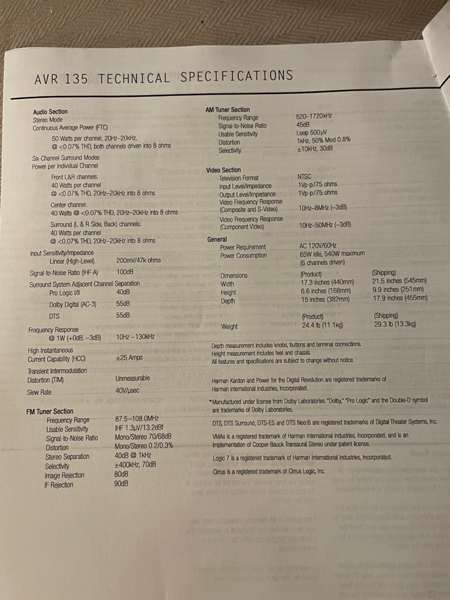 Harman Kardon AVR 135 6.1 Channel 240 Watt (Total power All channels) Receiver